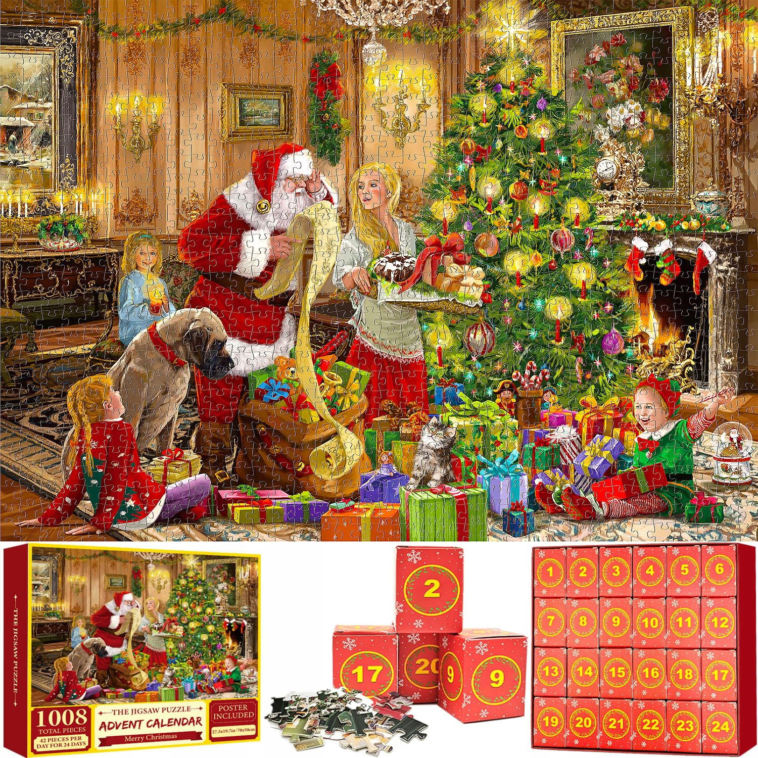 ⭐Kalendarz Adwentowy z Puzzlami 1008 el. | Świąteczna Scena z Rodziną i Mikołajem ⭐ Idealny Prezent Bożonarodzeniowy