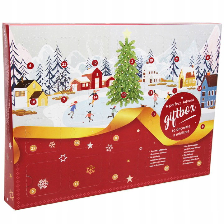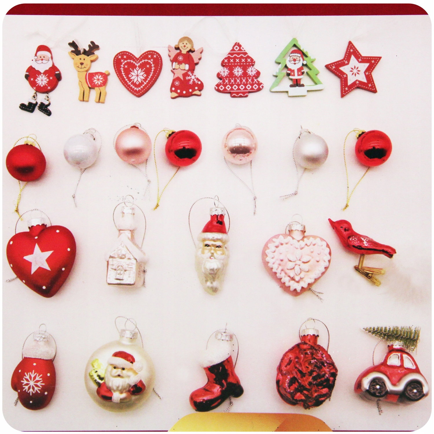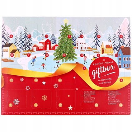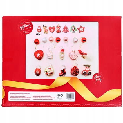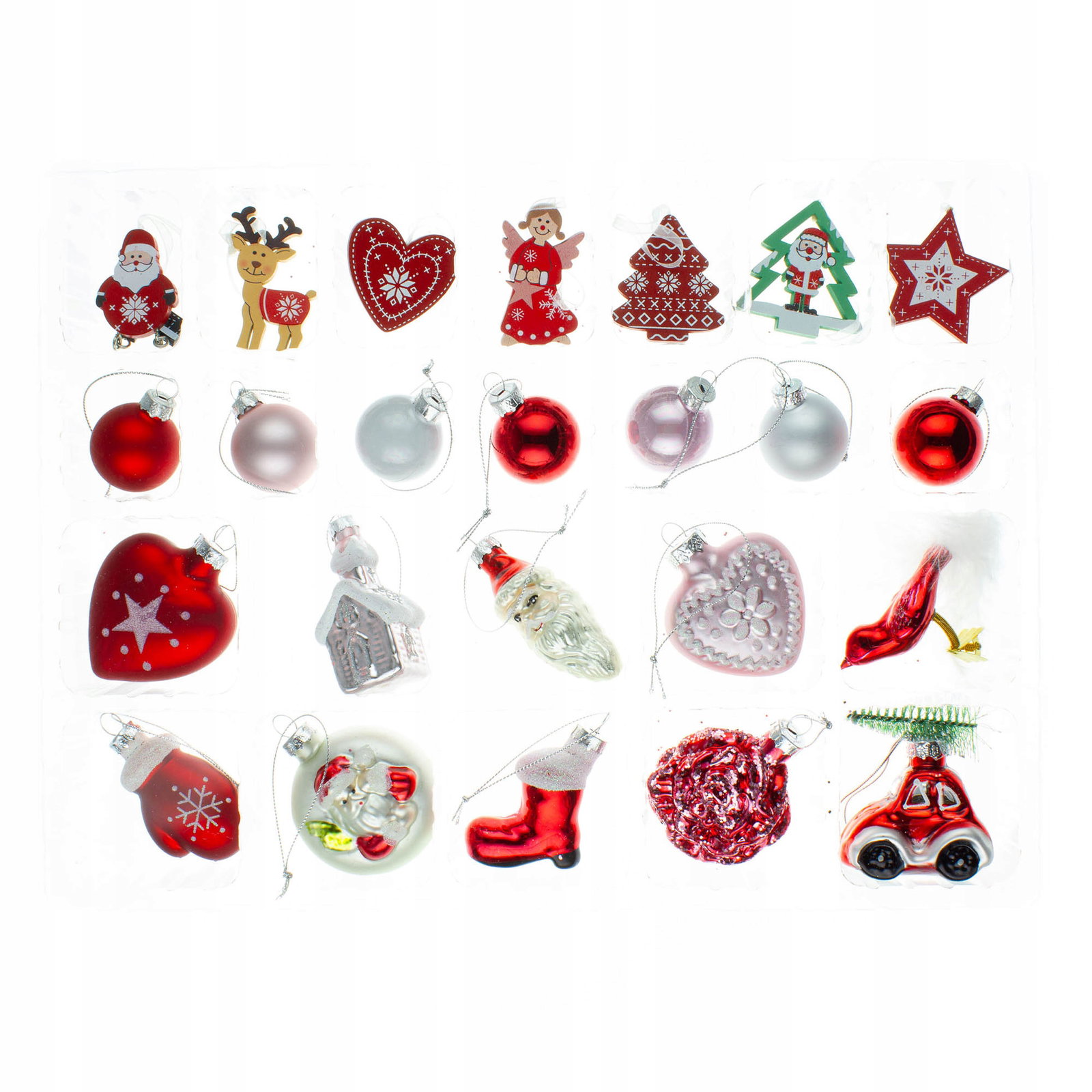 Kalendarz adwentowy z ozdobami na choinkę z dominującym kolorem czerwonym. Świetny prezent dla najmłodszych, każdego dnia dziecko odkrywa kolejną ozdobę choinkową odliczając czas do Świąt Bożego Narodzenia. Zestaw idealny do udekorowania małej choinki.