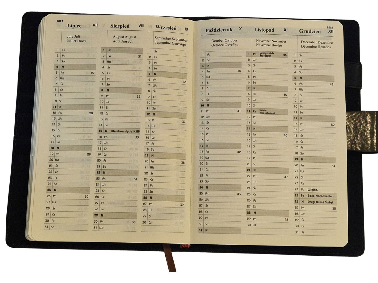 - Dwie dodatkowe strony pomiędzy miesiącami z planem na kolejny miesiąc i na notatki.