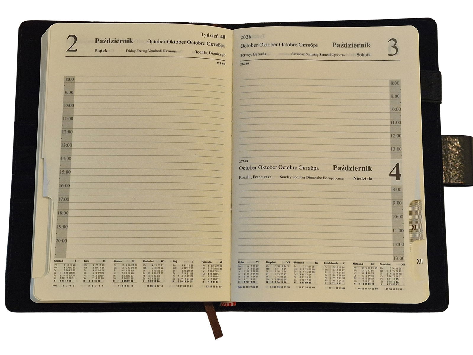 - Dodatkowe strony - na początku każdego miesiąca, notatki i plan na nowy miesiąc, notes teleadresowy, plan roczny.