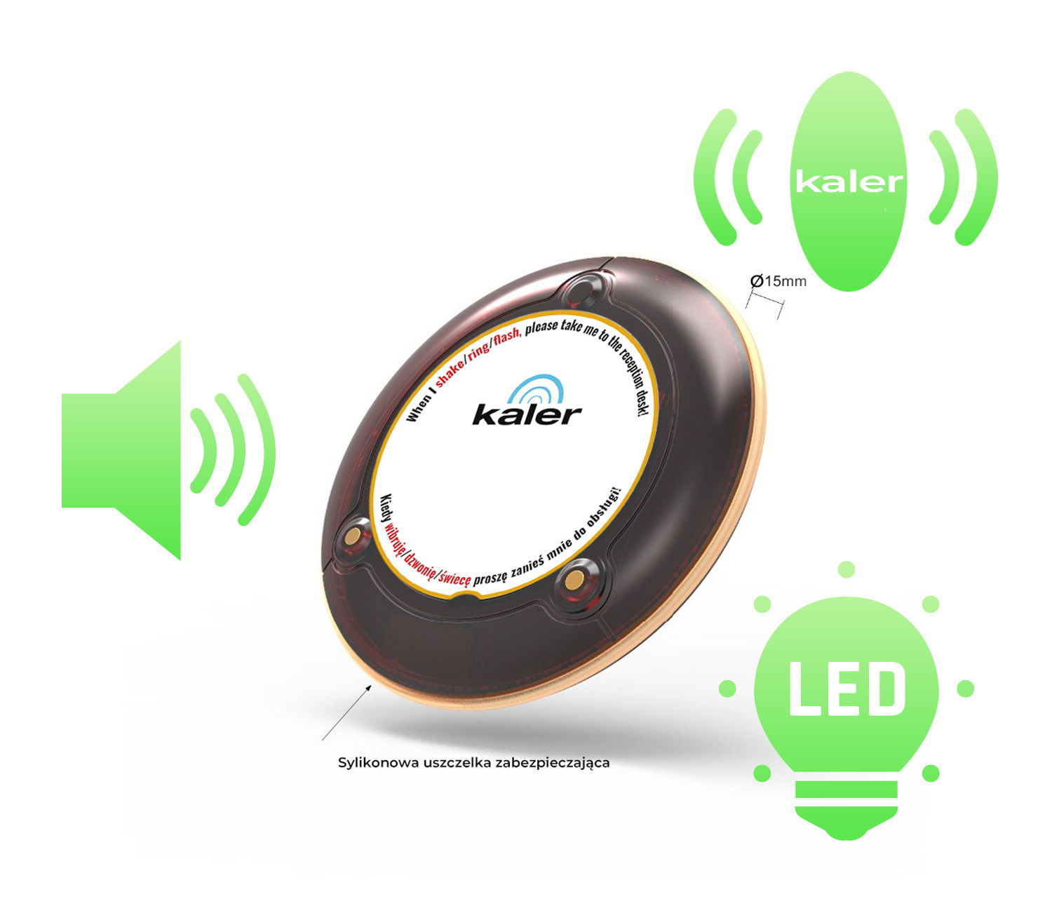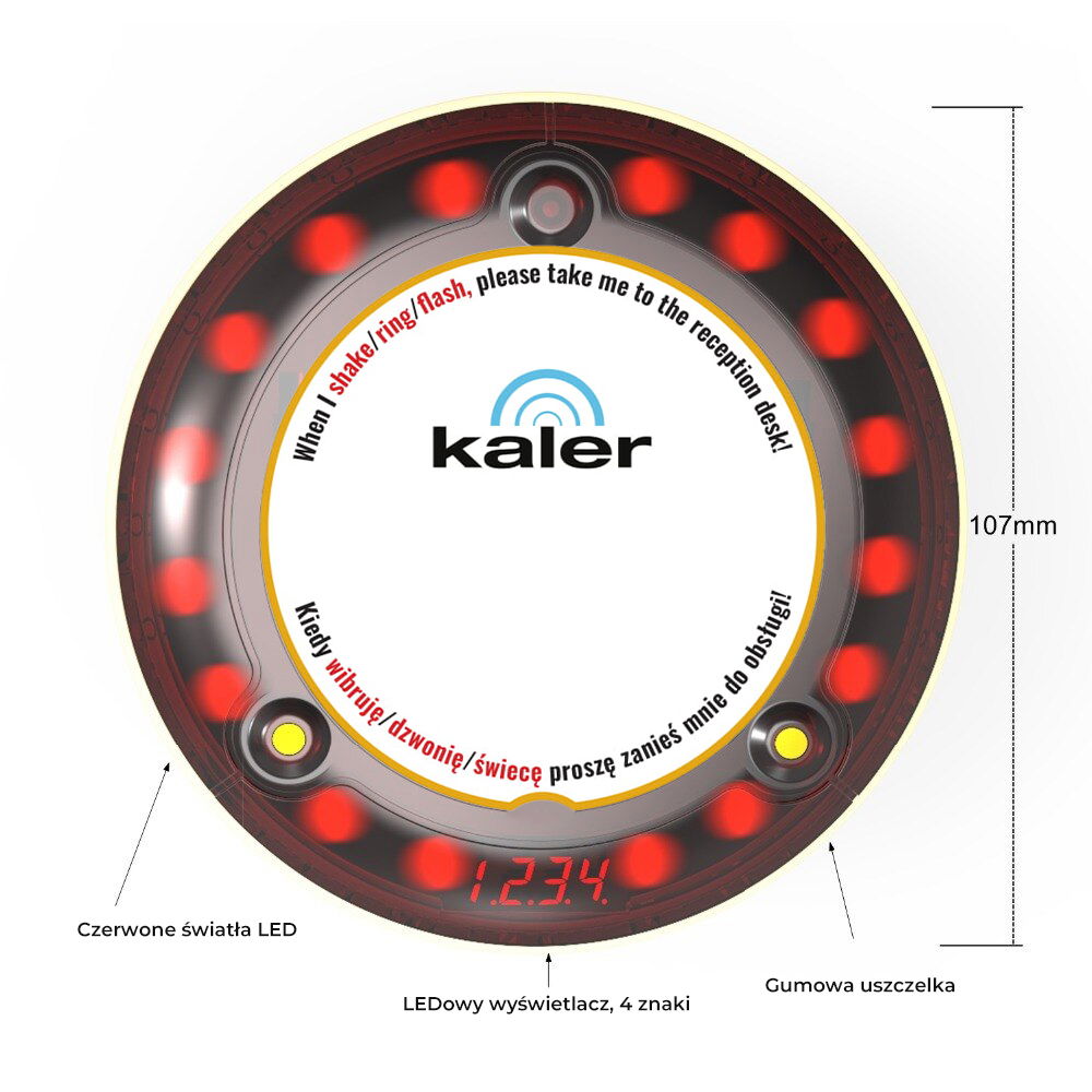 Kaler GEN-B6, to podręczne urządzenie przeznaczone do dyskretnego powiadamiania klienta o możliwości odbioru zamówienia. Kaler GEN-B6 jest elementem bezprzewodowego systemu powiadamiania klientów stworzonego z myślą o poprawie jakości obsługi klienta. Do sygnalizacji komunikatu powiadomienia urządzenie wykorzystuje dźwięk, wibracje oraz światło LED. Wbudowany wyświetlacz pokazuje numer pagera. Duży zasięg odbiornika pozwala wykorzystać go nawet w największych lokalach. Możliwość ustawienia dyskretnego powiadomienia przy użyciu wibracji oraz bezprzewodowy charakter urządzenia pozwalają obniżyć poziom natężenia dźwięku w lokalu oraz poprawić komfort klienta.