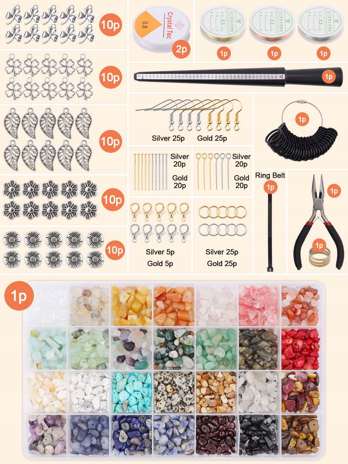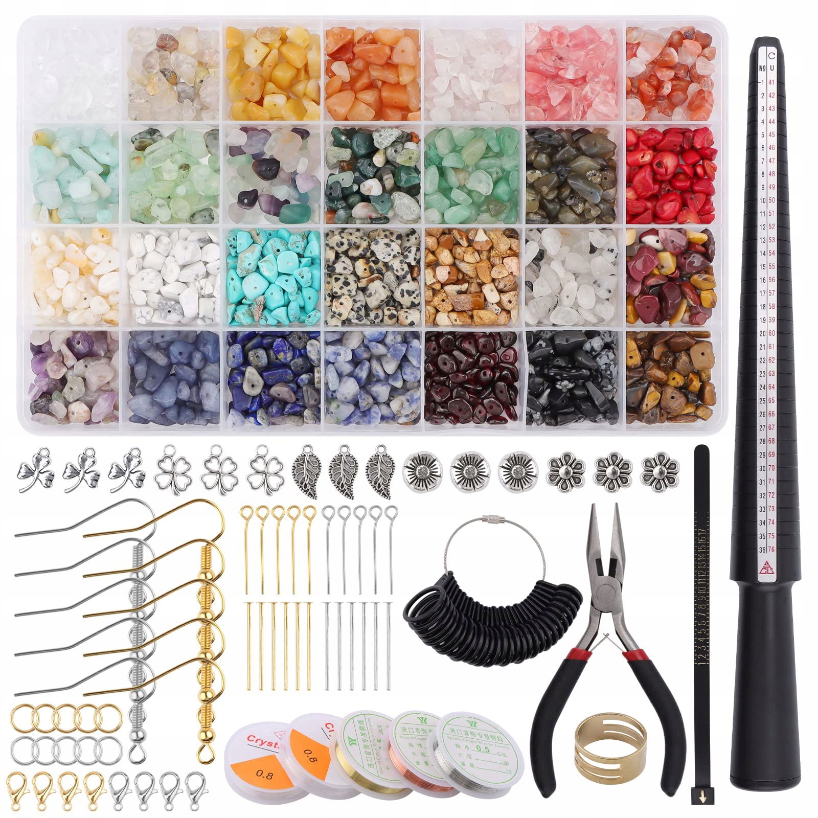 Akcesoria do tworzenia biżuterii: Nasz zestaw do tworzenia biżuterii zawiera 28 koralików z siatki kryształowej, 1 szczypce(brak), 1 pasek do pierścionków, 1 otwieracz do pierścionków, 1 wskaźnik rozmiaru pierścionków, 1 zestaw rozmiarów palców, 2 elastyczne nici, 3 druty miedziane, 10 zapięć karabińczykowych, 50 zawieszek, 50 podzielonych pierścionków, 50 haków do kolczyków, około 80 szpilek, wystarczająca ilość, aby zaspokoić Twoje potrzeby w zakresie DIY biżuterii.