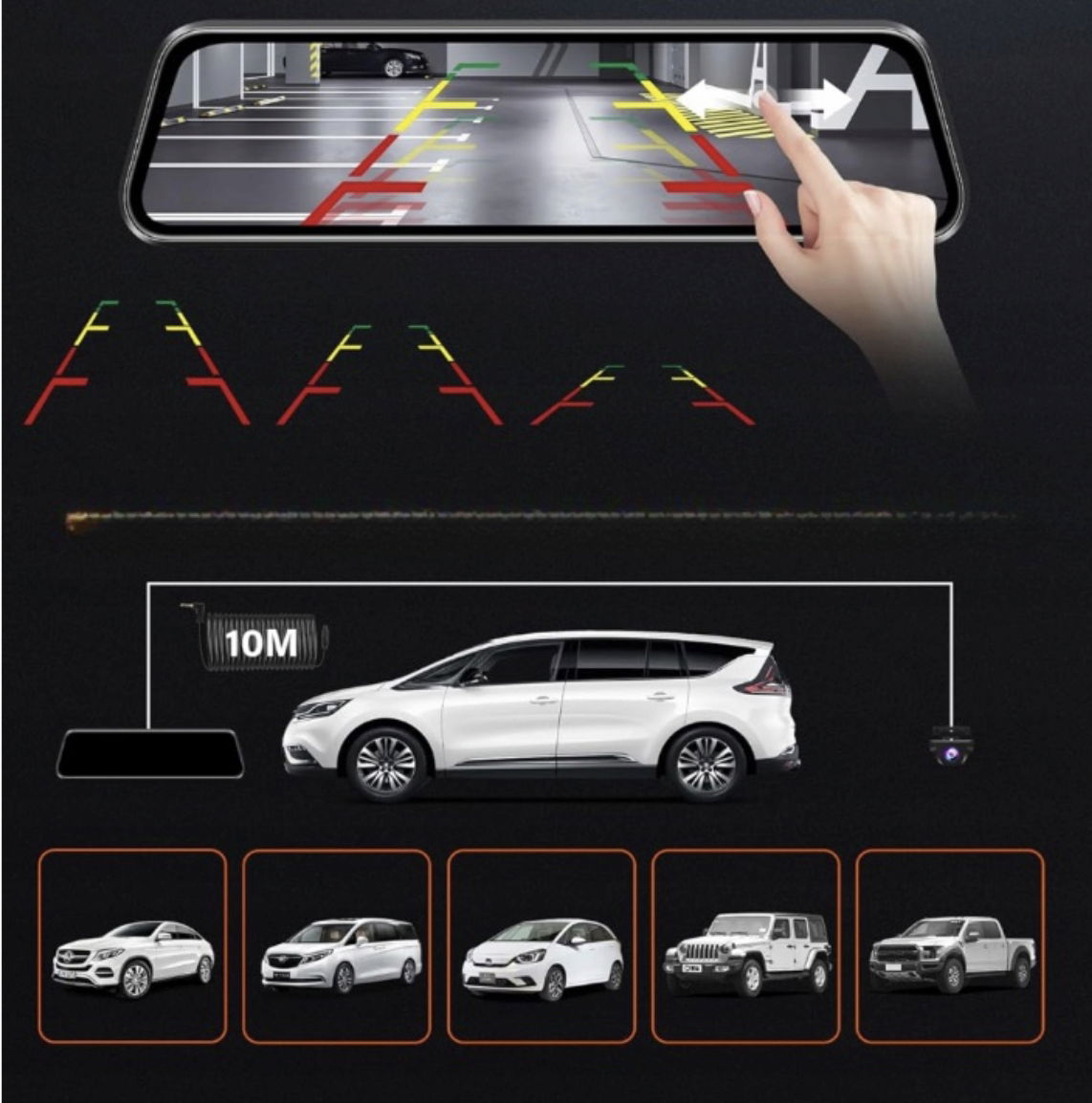 Pełny ekran dotykowy 10", aby całkowicie zakryć oryginalne lustro, lepsza widoczność do tyłu, eliminuje martwe kąty spowodowane bagażem, itp. i poprawia bezpieczeństwo