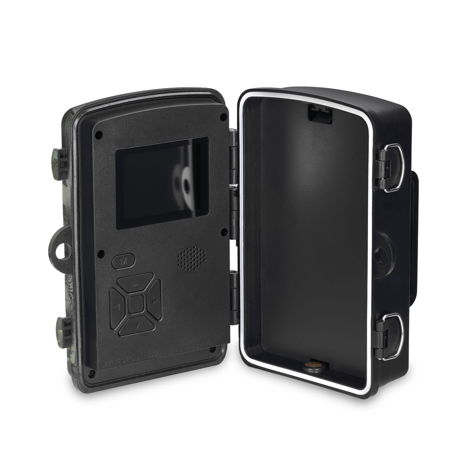 Specjalnie zaprojektowana leśna kamera w odpornej na warunki atmosferyczne obudowie, przystosowanej do zawieszenia na drzewie. Obudowa w zielonym kamuflażu, idealnie maskuje się na tle drzew i zieleni.