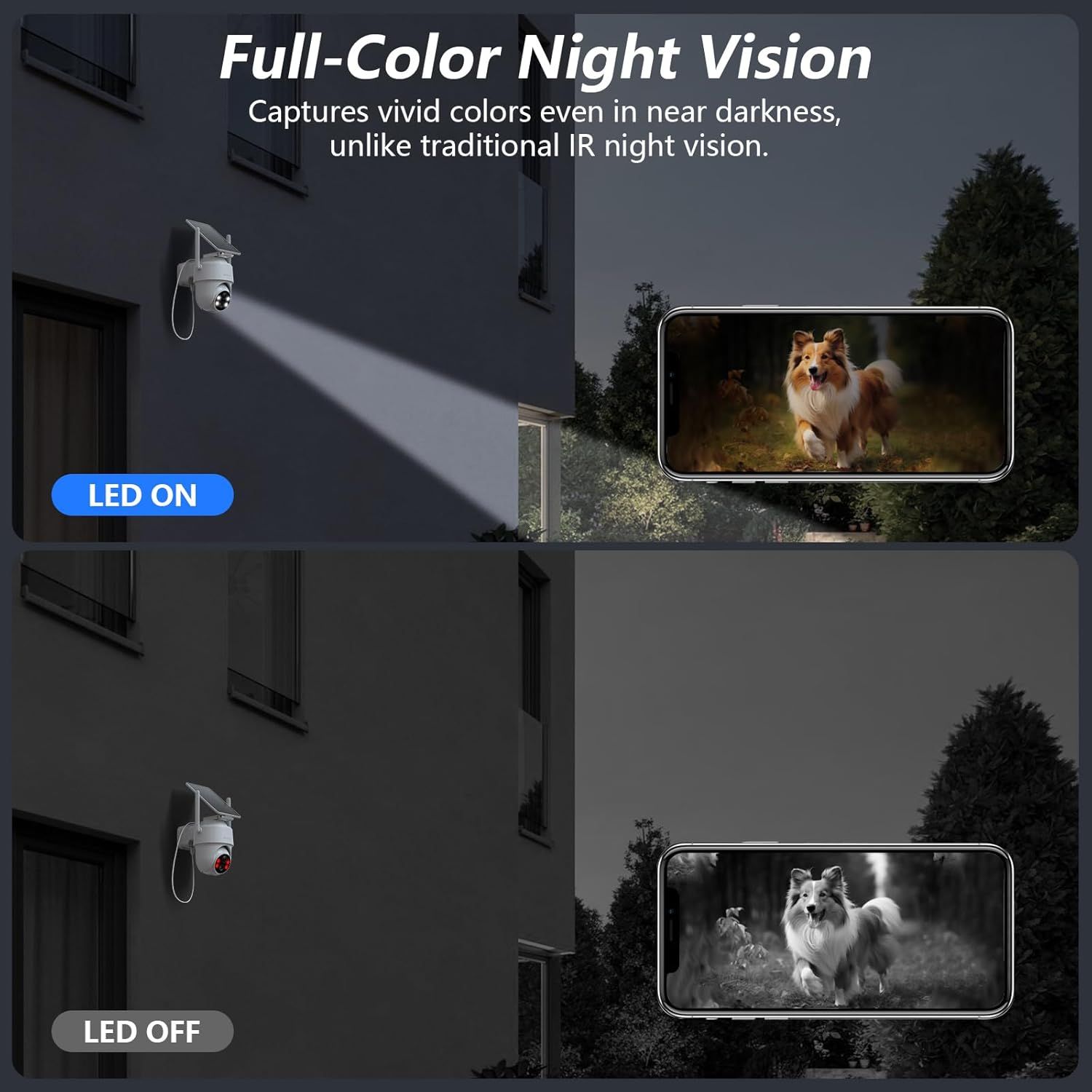 - Widoczność w nocy w kolorze z reflektorami i syreną alarmową: solarna kamera monitorująca obsługuje trzy tryby widzenia w nocy: tryb podczerwieni, tryb pełnokolorowy i syrena alarmowa. Ustaw syrenę alarmową i reflektory tak, aby automatycznie włączały się po wykryciu ruchu, dzięki czemu natychmiast wiesz o tym i odstraszysz niechciane osoby