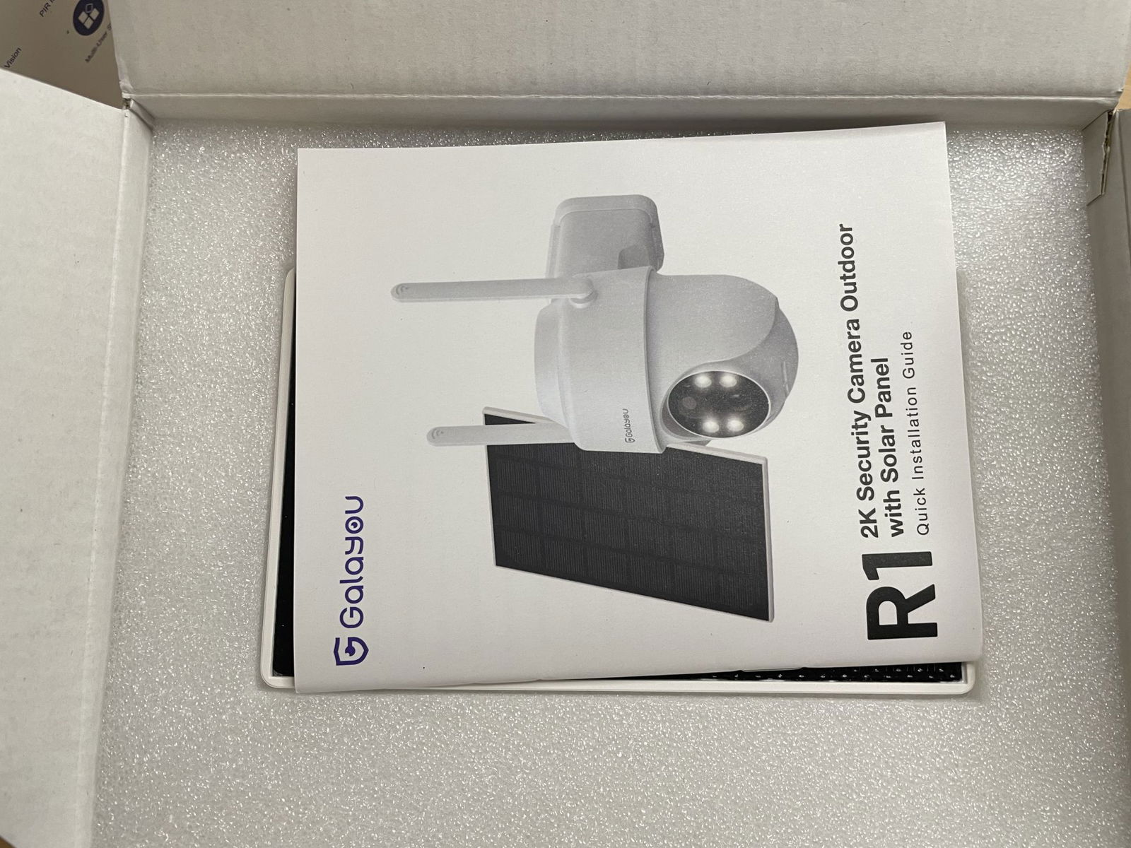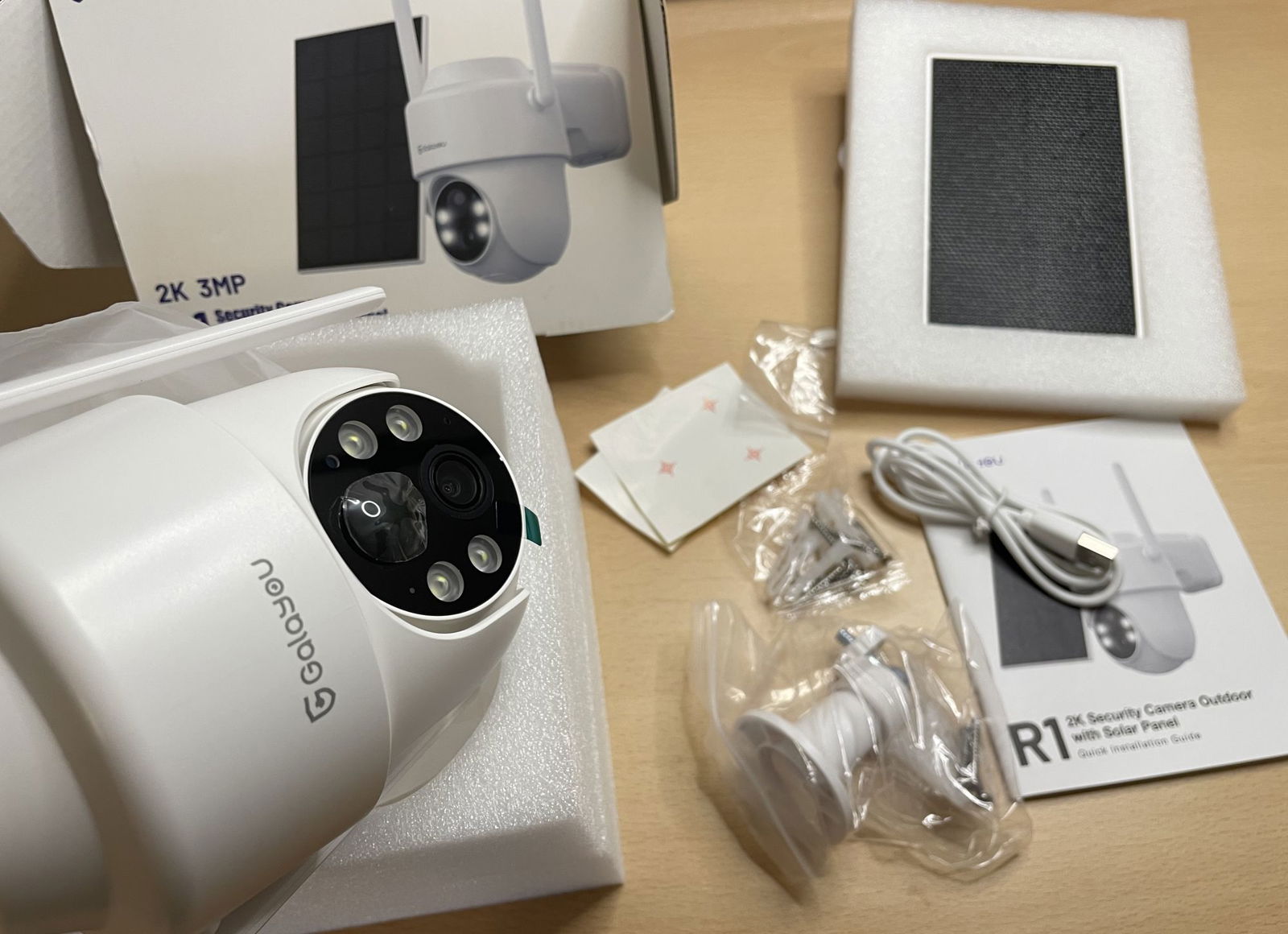 Kompletny zestaw: kamerka R1, instrukcja, panel słoneczny, elementy montażowe: 1 x kabel typu C, 2 x szablon do otworów montażowych, 1 x opakowanie śrub
