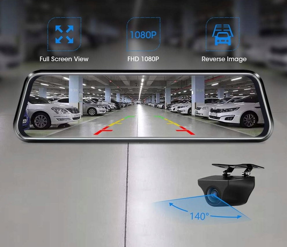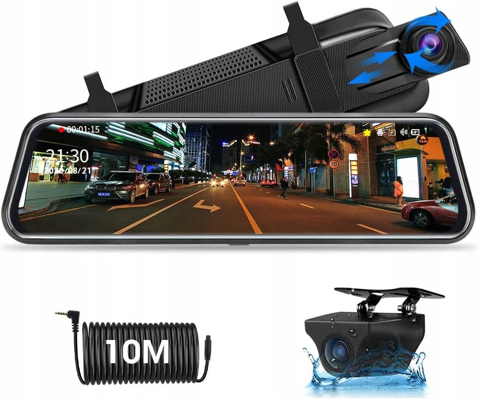 - W zestawie: 25,4 cm lustrzana kamera samochodowa, kamera cofania 1080p, kabel 10 m do kamery cofania, ładowarka samochodowa 4,9 m, 2 gumowe paski, instrukcja obsługi.