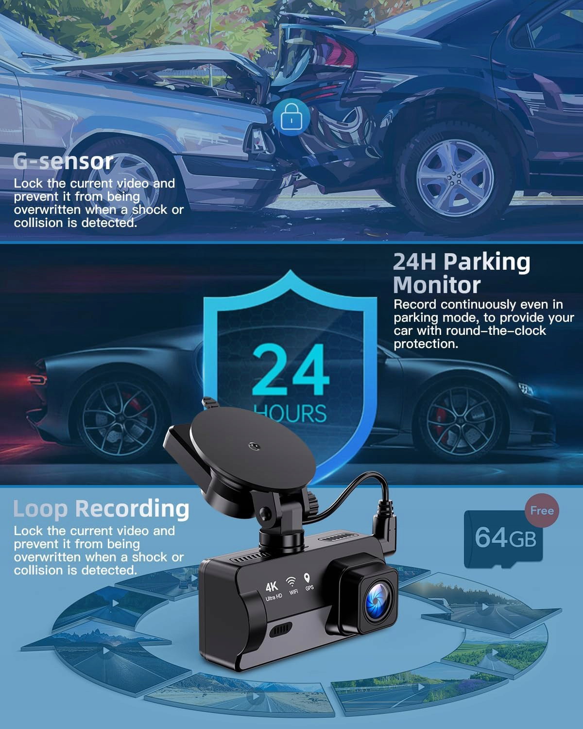 Pełna kamera na desce rozdzielczej samochodu umożliwia nagrywanie w pętli, co umożliwia ciągłe nagrywanie, gdy karta pamięci jest pełna; Gdy czujnik G wykryje nagłą kolizję, blokuje i zapisuje wideo z kolizji; 24-godzinny monitor parkowania umożliwia nieprzerwane nagrywanie kamerą samochodową przez 24 godziny z funkcją Timelapse w trybie parkowania (wymagany zestaw typu CHardwire)