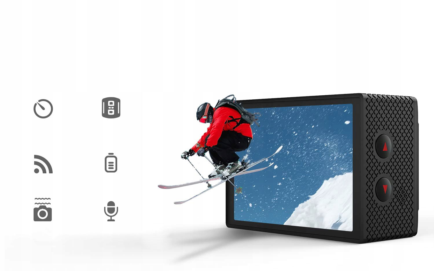 Nawet w hałaśliwych miejscach, takich jak jazda na nartach, jazda na rowerze itp., dźwięk wideo jest wyraźnie słyszalny. Obiektyw szerokokątny 170 stopni pozwala kamerze uchwycić najlepszy widok lub ważny moment z Twojego życia.