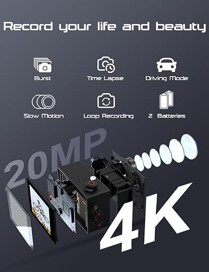Wielofunkcyjna kamera akcji: W tym nagrywanie w pętli, fotografia w zwolnionym tempie, tryb jazdy, obracanie obrazu, zdjęcia poklatkowe, regulacja ekspozycji, regulacja balansu bieli; Możesz zabrać kamerę do różnych środowisk sportowych i używać jej, efekt przekroczy Twoje oczekiwania.
