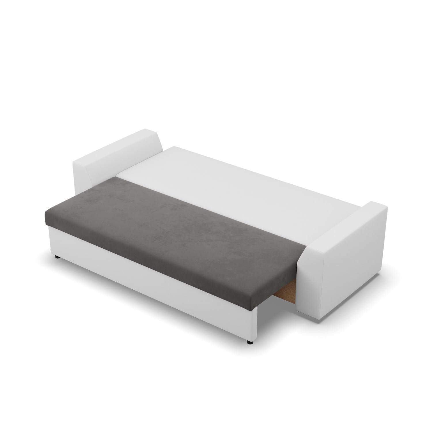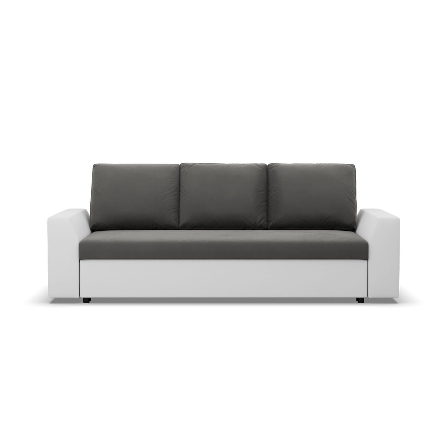 Kanapa rozkładana, Viktor, velvet, ekoskóra, 232x92x92 cm, biel, szary. Zadbaj o kącik wypoczynkowy z komfortową kanapą VIKTOR! Nowoczesna kanapa z wypełnieniem piankowym świetnie sprawdzi się w każdym salonie lub pokoju dziennym, oszałamiając swoją estetyką. Klasyczna forma mebla połączona z funkcjonalnymi rozwiązaniami technologicznymi w postaci podłokietnika, luźnych poduszek i pojemnika na pościel będzie idealną ozdobą i jednocześnie miejscem spotkań z rodziną i przyjaciółmi.