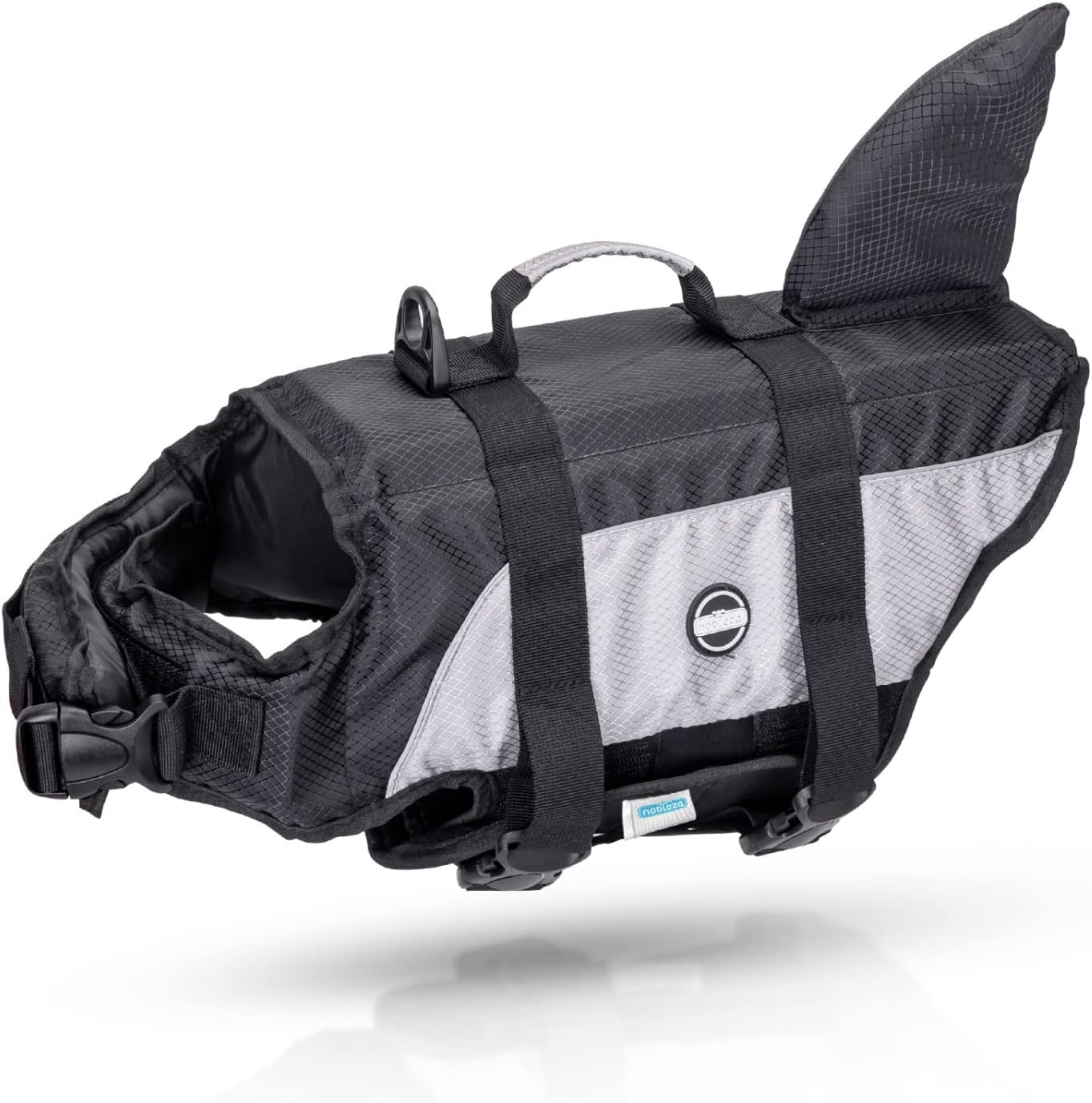 Nobleza - Kamizelka ratunkowa dla psów z płetwą rekina, kamizelka do pływania z paskami odblaskowymi, kamizelka dla psa z uchwytem i wysoką wypornością do pływania, surfowania, żeglowania, kolor szary (XL).
