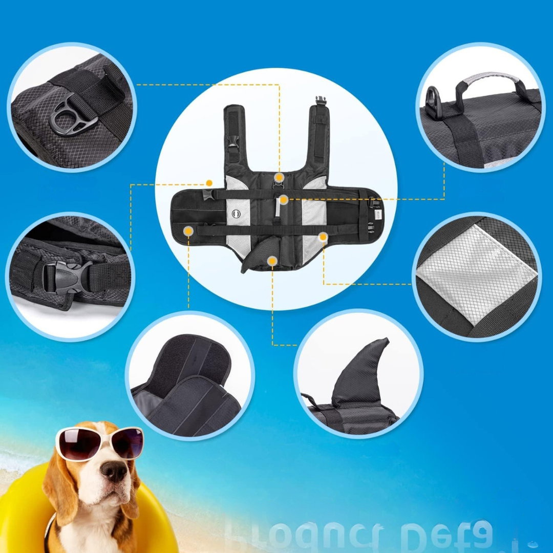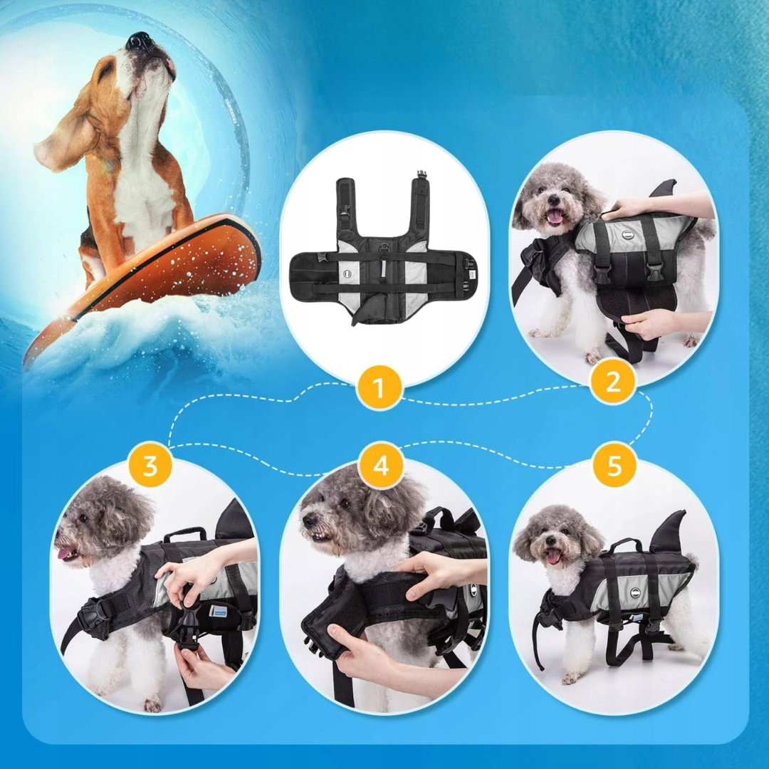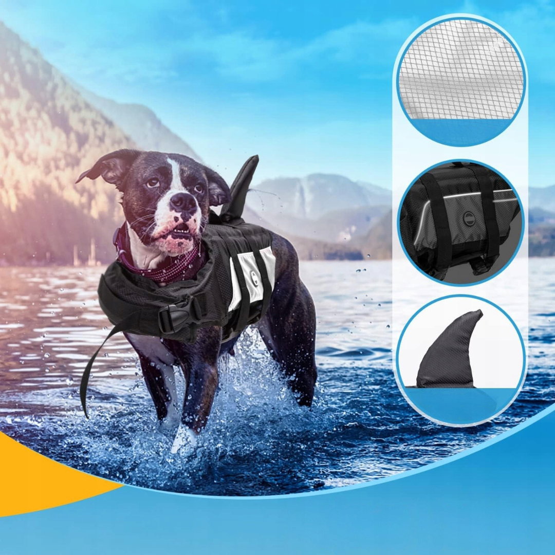Jaskrawe kolory, odblaskowe elementy oraz stylowy design z płetwą rekina ułatwiają lokalizację psa w wodzie i dodają mu wyjątkowego wyglądu.
