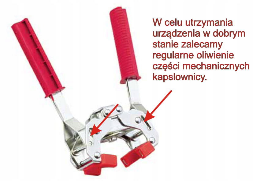 Kapsel nakładamy na butelkę a następnie odchylając ramiona kapslownicy do góry nakładamy ją na kapsel. Następnie jej ramiona ściągamy w dół, aż do momentu, gdy poczujemy opór. Po zakapslowaniu butelki ramiona ( z wyczuciem ) unosimy do góry i zdejmujemy kapslownicę z butelki.