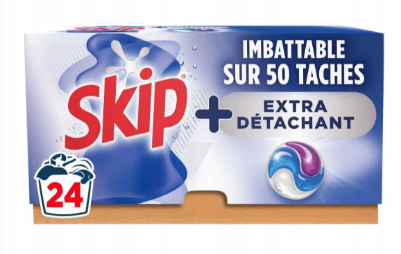 Kapsułki do prania Skip All in 1 Extra Stain Remover 24 Wash są bezkonkurencyjne w usuwaniu 50 plam* i skuteczne w krótkim cyklu na zimno, gwarantując w 100% nienaganny efekt. Wielokomorowa technologia kapsułek z detergentem Skip usuwa najbardziej uporczywe plamy, takie jak sos pomidorowy, czekolada, herbata, olej, czerwone owoce, a nawet trawa.