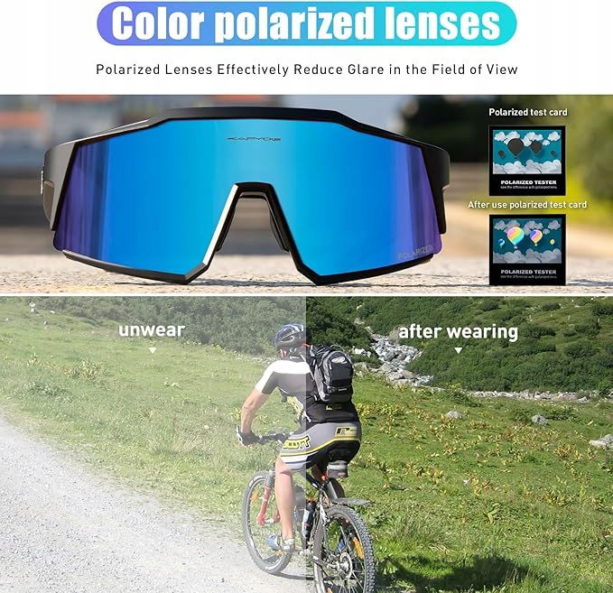 Wyjątkowa wydajność polaryzacyjna: Nasze gogle rowerowe wykorzystują soczewki z octanu celulozy i triacetanu z wysokiej jakości powłoką polaryzacyjną HD. Posiadają one unikalną powłokę polaryzacyjną, która eliminuje odblaski i zapewnia niezrównaną przejrzystość wizualną. Pod słońcem odkryjesz dokładniejsze pole widzenia, szanse na zmęczenie oczu zostaną zmniejszone, a Ty będziesz bezpieczniejszy i bardziej komfortowy na drodze.