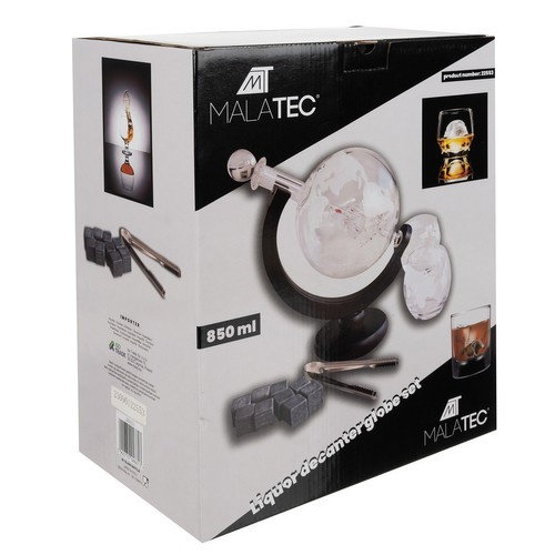 - DUŻY ZESTAW – cały zestaw zawiera karafkę w kształcie globusa, 2 szklanki z utrzymanym wzorem, 2 korkowe podkładki z mapą; 9 kamiennych kostek do chłodzenia oraz szczypce do higienicznego umieszczenia kostek w szklance. Jest to zestaw, który ucieszy każdego miłośnika whisky, a także podróżnika.