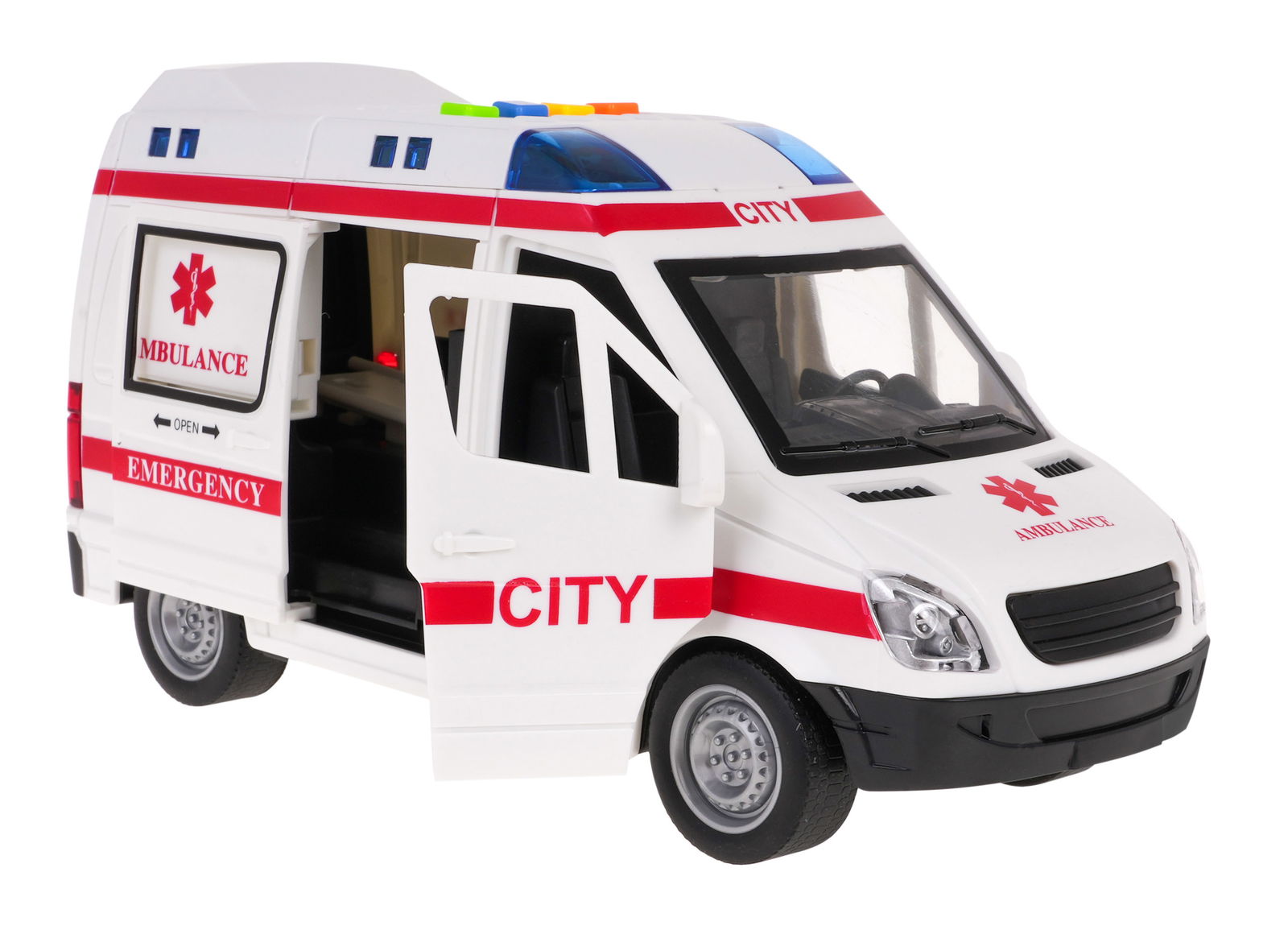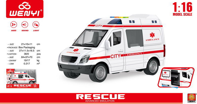 Interaktywna karetka w skali 1:16 to idealna zabawka dla dzieci od 3. roku życia. Wyposażona w efekty dźwiękowe i świetlne, posiada otwierane drzwi boczne i tylne oraz napęd na tylne koła. Ambulans ma panel dźwiękowo-świetlny z odgłosami odpalania pojazdu, klaksonem i sygnałami alarmowymi. Gumowe opony zapewniają lepszą przyczepność, a suwalne nosze dodają realizmu. Zasilany bateriami typu 3 x AG13 (w zestawie), karetka oferuje dynamiczną jazdę do przodu i do tyłu. Wymiary karetki to ok. 22 cm x 8,5 cm x 12 cm, a opakowania: ok. 27 cm x 16,5 cm x 11,5 cm. Zestaw zawiera karetkę wraz z wymienionymi funkcjami.