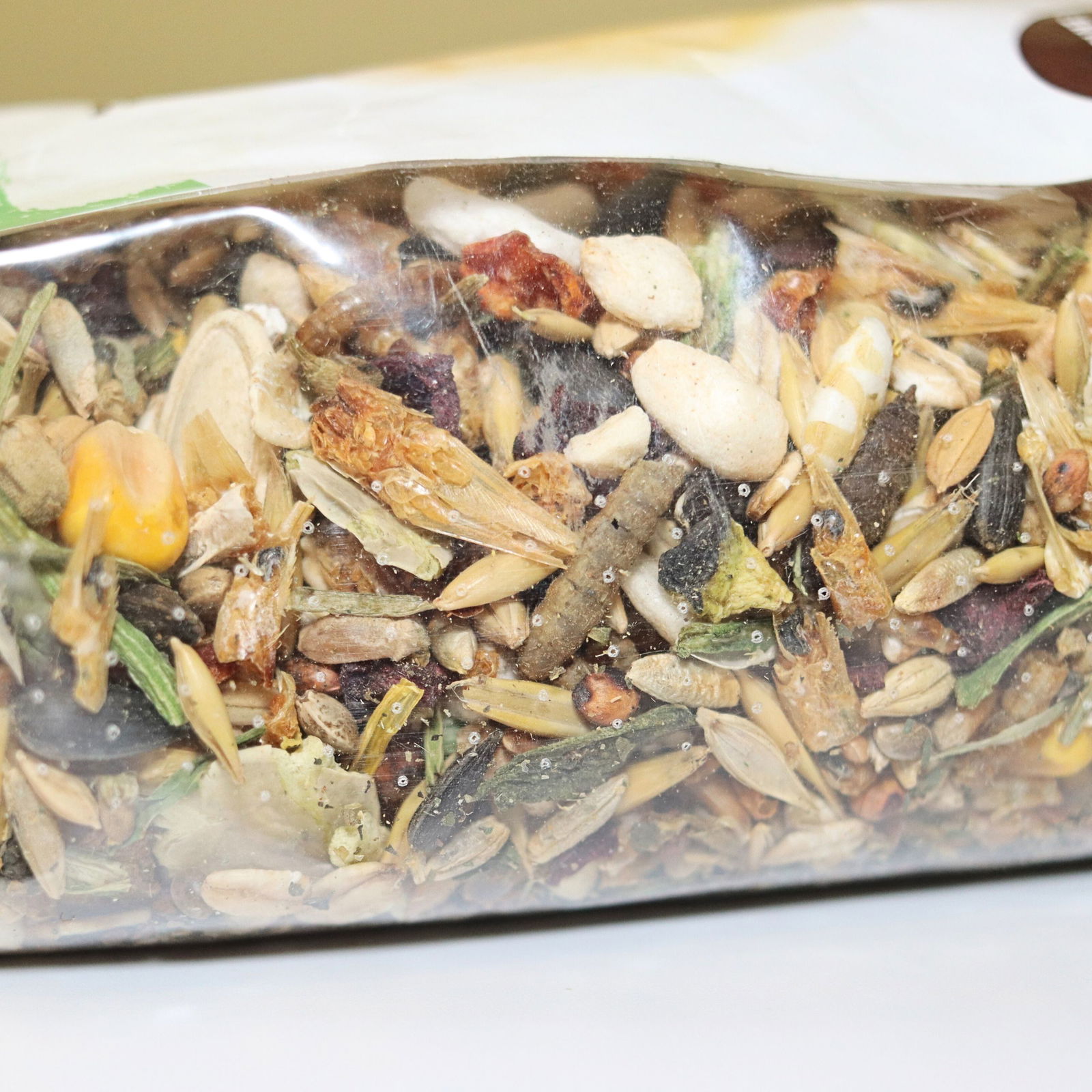Pszenica, kukurydza, płatki owsiane, żyto, krewetki słodkowodne, owies, jęczmień, płatki grochu, nasiona słonecznika, ryż niełuskany, larwy mącznika, orzeszki ziemne, rodzynki, proso milo, ryż, kasza jaglana, siemię lniane, liście mięty pieprzowej, sezam, marchew, łodygi szpinaku, sorgo dari, pestki dyni, buraki, liście mniszka, krokosz barwierski, nasiona nigru, chipsy bananowe, płatki orkiszowe, nasiona konopi, płatki pomidorowe, cukinia, kwiat rumianku, kwiat nagietka.