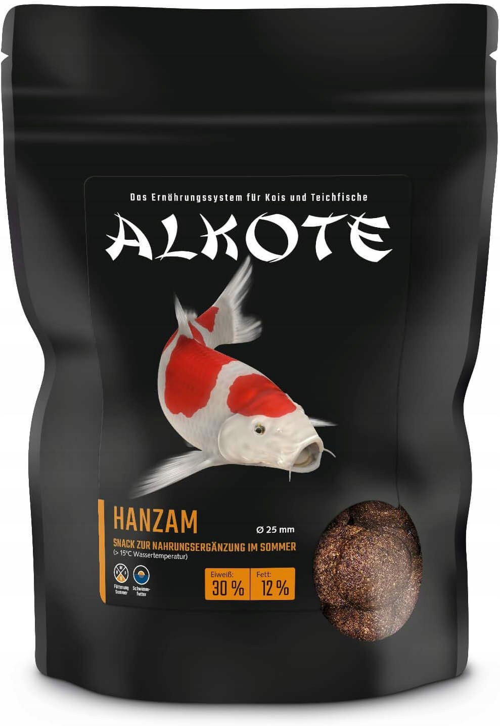 Hanzam Supersnack to pływający przysmak dla koi o wielkości około 2,5 cm, który koi chętnie biorą z ręki. Początkowo przysmak należy trzymać pod wodą, aż koi zauważą monetę Hanzam. Alkote Hanzam Koi unosi się na wodzie na tyle długo, że nawet wolno pływające ryby mogą go skosztować. Jeśli nie stosowałeś wcześniej tego pokarmu, stopniowo przyzwyczajaj do niego ryby.