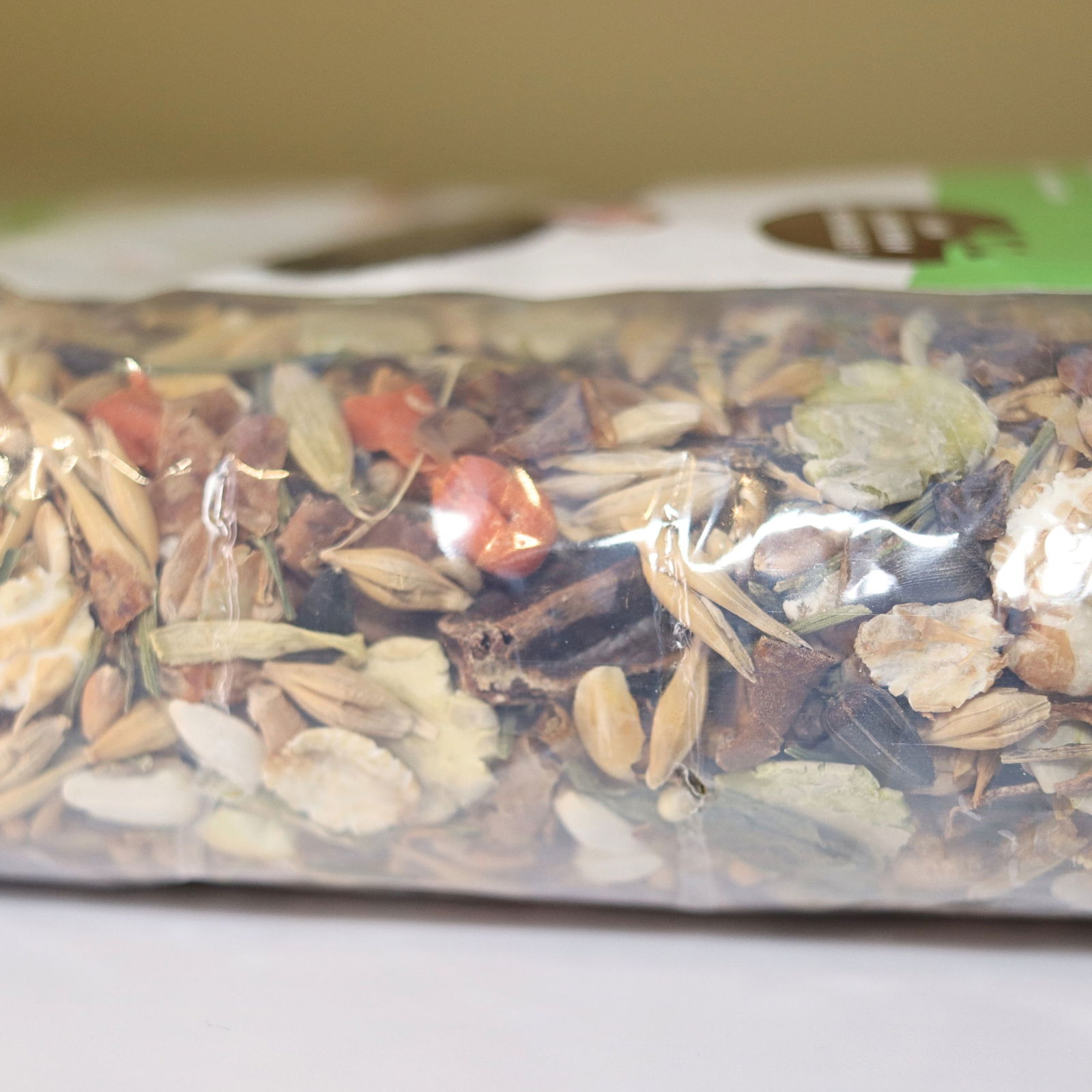 Skład:Jabłko, jęczmień, pszenica, owies, kukurydza, natka pietruszki, kasza gryczana, proso żółte, płatki jęczmienne, płatki grochu, nasiona słonecznika, chleb świętojański, krokosz barwierski, plasterki marchwi, pszenica (dmuchana), nasiona traw, larwy mącznika młynarka, płatki owsiane, płatki bobu, orzeszki ziemne, kwiat nagietka, babka lancetowata, pestki dyni.