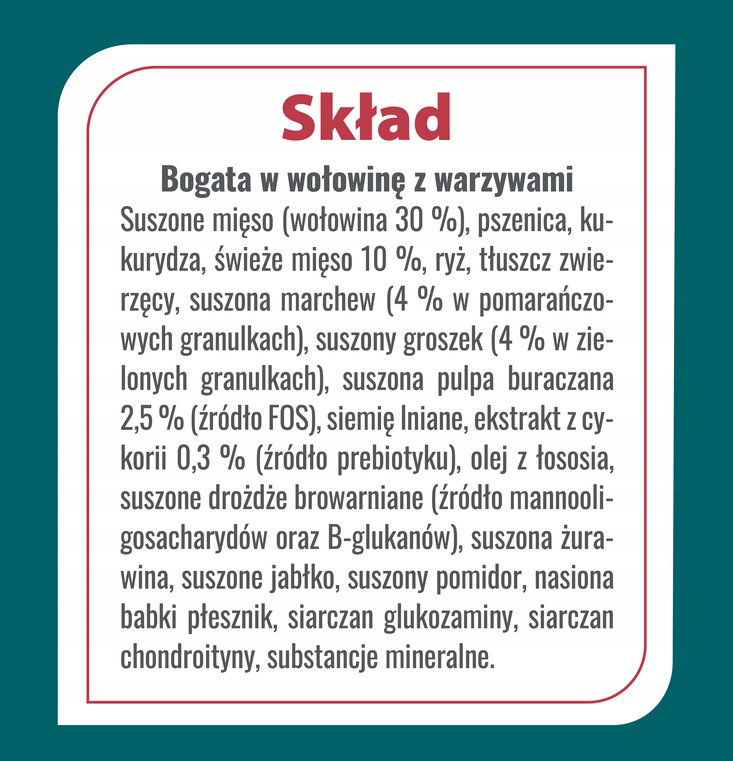 Suszone mięso (wołowina 30%), pszenica, kukurydza, świeże mięso 10%, ryż, tłuszcz zwierzęcy, suszona marchew (4%), suszony groszek (4%), siemię lniane, olej z łososia, suszona pulpa buraczana (2,5%), ekstrakt z cykorii, suszone jabłko, suszony pomidor, żurawina, nasiona babki płesznik, drożdże browarniane, glukozamina, chondroityna.