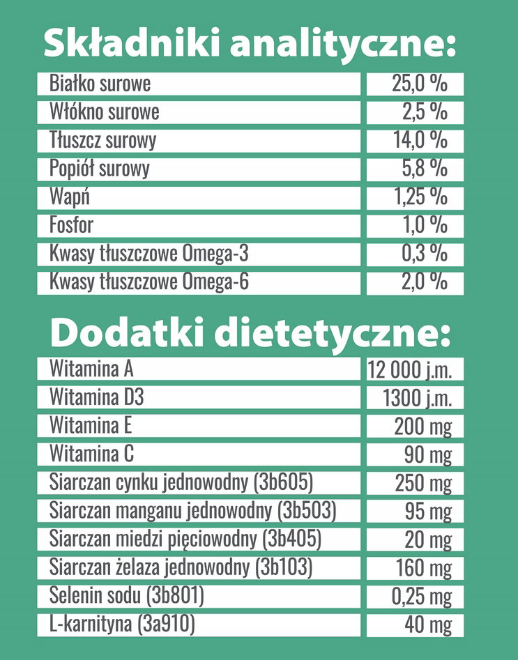 - 83% białka pochodzenia zwierzęcego – wspomaga zdrowy rozwój mięśni i zapewnia energię