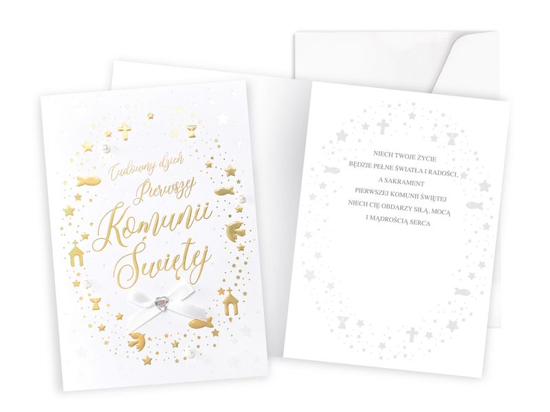 Kartki z serii DK, to kartki z ilustracjami, idealne na takie okazje jak Komunia Święta o wymiarach B6 (16,6 cm x 11,7 cm po złożeniu) z motywem "Cudowny dzień Pierwszej Komunii Świętej". W zestawie znajduje się także koperta. Posiadają delikatne złote, bądź akwarelowe zdobienia a w ich wnętrzu znajdują się życzenia.