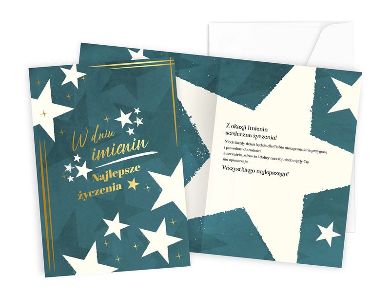 Kartka na Urodziny - Passion Premium z nadrukiem "Imieniny (gwiazdki)" o wymiarach B6 (16,6 cm x 11,7 cm po złożeniu). Kartki z serii Passion Premium to świetny pomysł na piękną pamiątkę, każda kartka jest zdobiona przynajmniej dwoma rodzajami uszlachetnień - metaliczne lub perłowe folie, brokat, tłoczenie itp. - tyle piękna w takim drobiazgu (uzależnione od rodzaju kartki)! Każda kartka Passion Premium ma kolorowe wnętrze z tekstem wyjątkowych życzeń i grafiką, w komplecie jest także dopasowana kolorystycznie koperta.