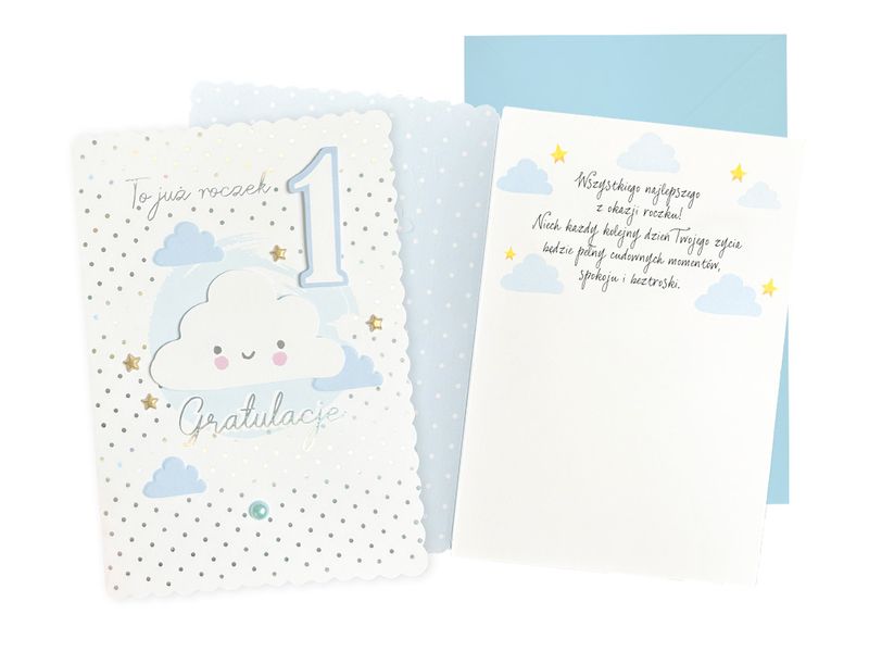 Kartki z serii DK, to kartki z ilustracjami, idealne na takie okazje jak urodziny (roczek) o wymiarach B6 (16,6 cm x 11,7 cm po złożeniu) z motywem "Urodziny (roczek, cyferki, chmuka)". W zestawie znajduje się także koperta. Posiadają delikatne złote, bądź akwarelowe zdobienia a w ich wnętrzu znajdują się życzenia.