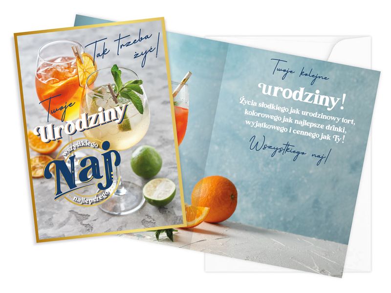 Kartka na Urodziny z nadrukiem "Urodziny (drinki)" o wymiarach 140 mm na 190 mm. Kartki z serii Vision to świetny pomysł na piękną pamiątkę! Każda kartka posiada dopasowaną kolorystycznie kopertę w komplecie. W środku kartki znajduje się krótki tekst z życzeniami, a pod spodem jest miejsce na własną dedykację