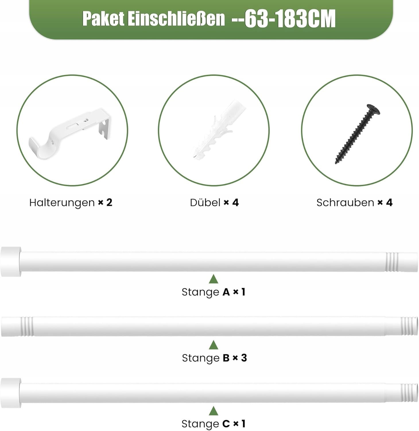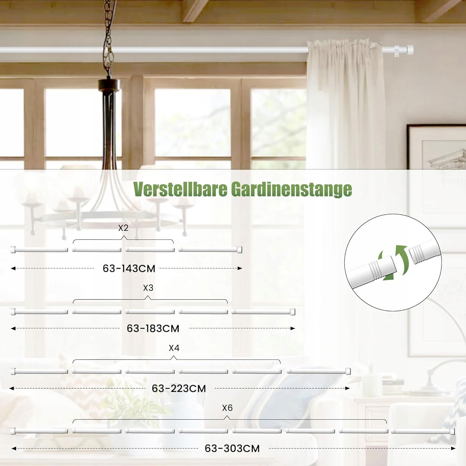 Regulowana długość: nasze karnisze składają się z kilku drążków. Poprzez dodanie lub pominięcie drążków długość karnisza można regulować w zakresie od 63 cm do 183 cm. Przed zakupem należy zmierzyć wymiary okna, aby upewnić się, że masz najlepsze wrażenia.