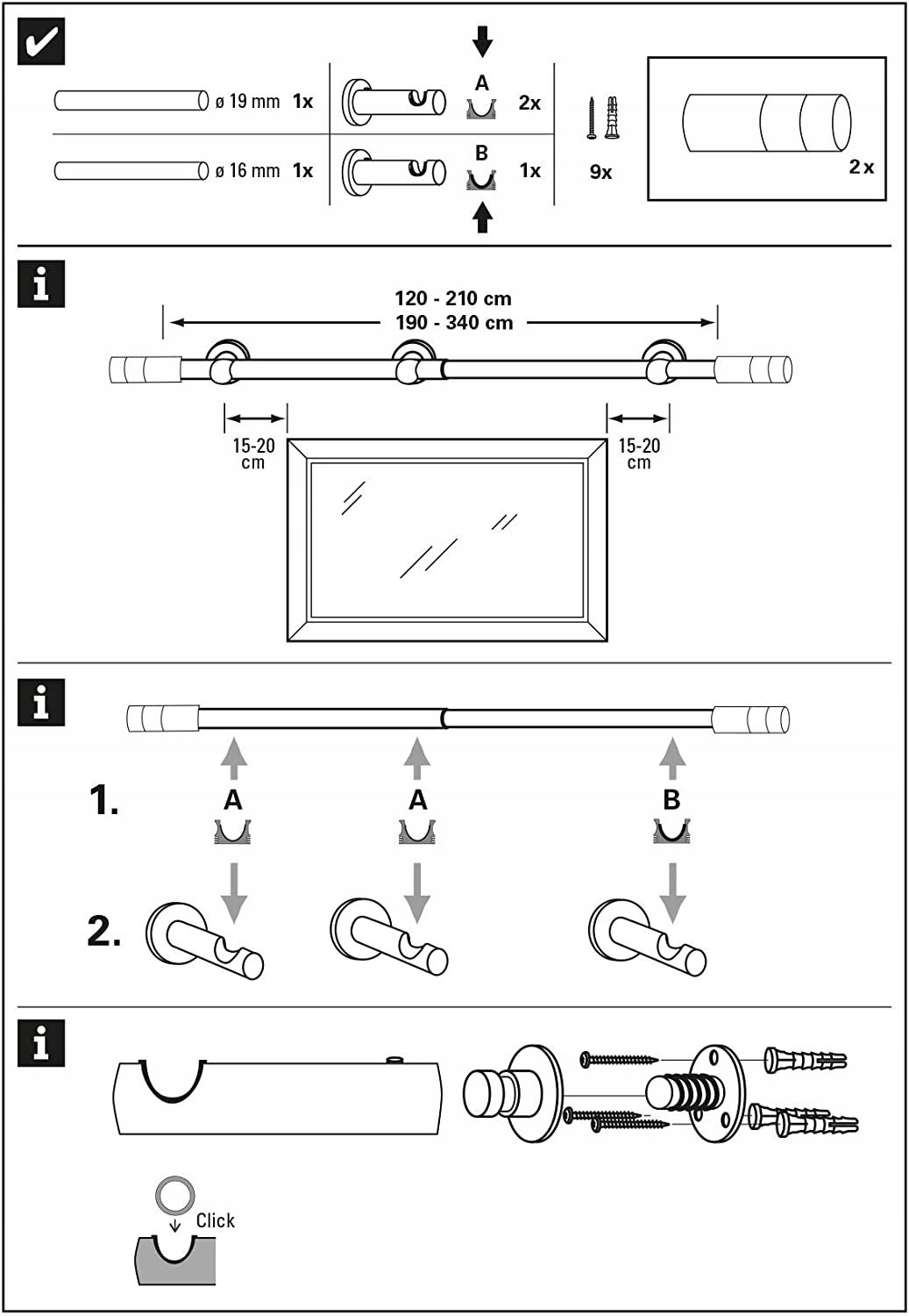 Łatwy montaż: mocowanie wsporników na ścianie, nałożyć zaślepki na końcach karniszy, przykręcić śruby drążka do wsporników (rozstaw ściany: 7,5 cm)