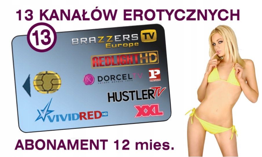 Karta XXX z dostępnością 14 kanałów XXX: Redlight HD, Hustler HD , Private HD, Dorcel HD, VIVID Red HD, Brazzers TV HD , XXL, VIVID Touch, Blue Hustler, Hustler TV, Dorcel TV (wersja Astra), Dorcel XXX, Vivid TV Europe, Vixen