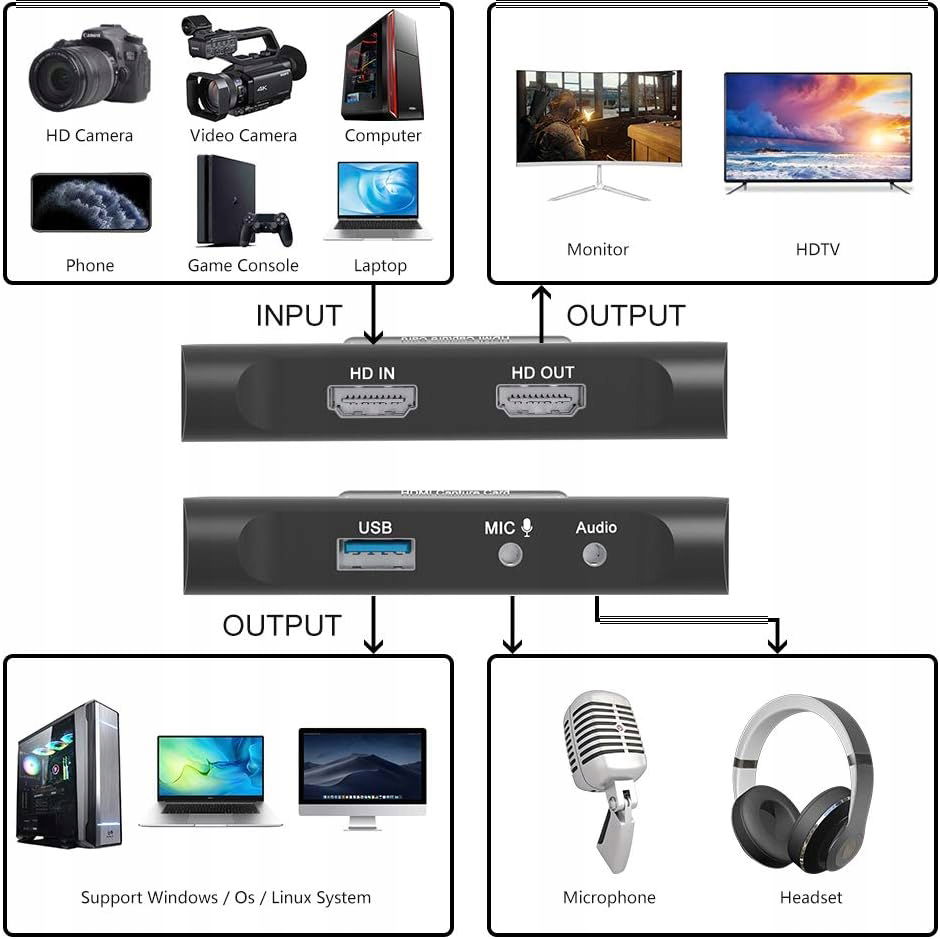 - 【Szeroka kompatybilność Video Grabber】Ta karta wideo jest wyposażona w 5 portów: port USB 3.0, wejście i wyjście HDMI, wejście i wyjście mikrofonu, wyjście audio. Urządzenie jest kompatybilne z aplikacjami wielu innych firm, takimi jak VLC, Quicktime, OBS, Amp; z bezpośrednim wyświetlaniem na Windows, Android, Mac OS X, video 4 Linux na Linux, z obsługą zarówno audio, jak i szerokiego ekranu