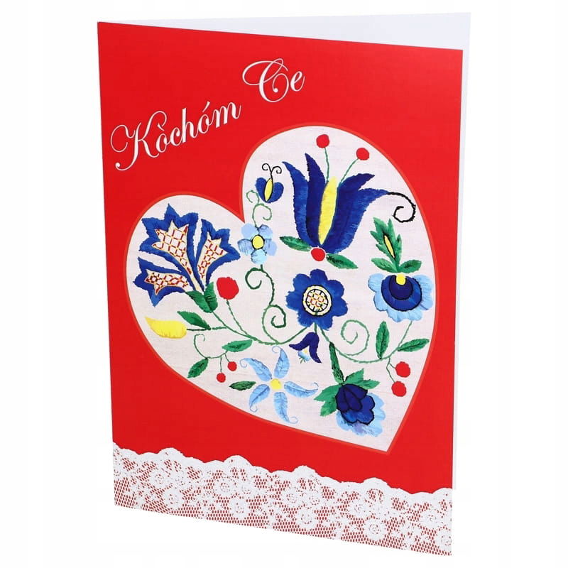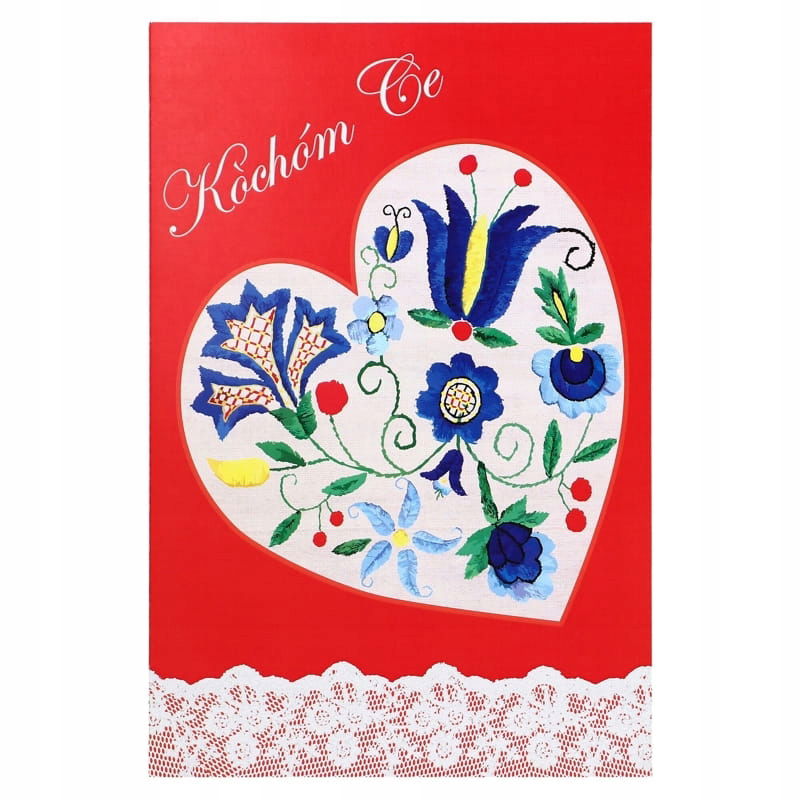 Kartka folk kaszubski - Kòchóm Ce. Kartka z kolorowym wzorem inspirowanym motywem kaszubskim. Zadrukowana jest na zewnątrz, wnętrze bez zadruku specjalnie na indywidualne życzenia. W komplecie: kartka z kopertą w kolorze białym. Całość w kaszubskich barwach ludowych z Kaszub.