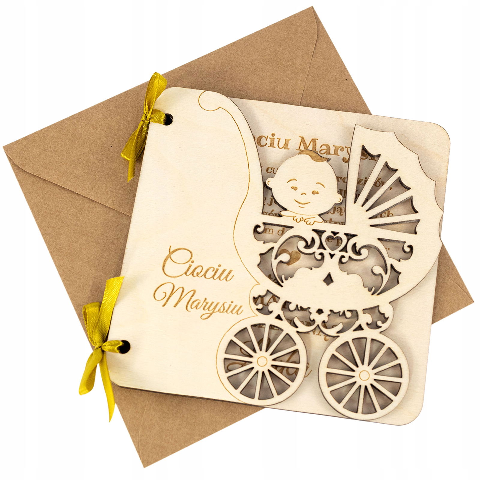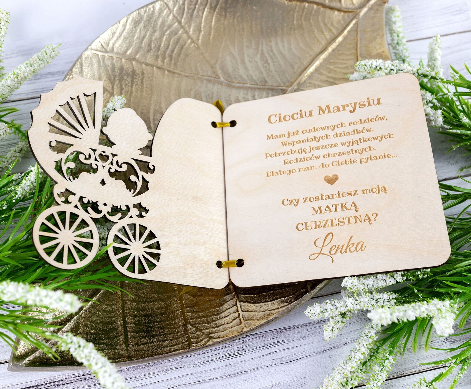 Drewniana otwierana kartka dla cioci lub wujka z prośbą o zostanie rodzicem chrzestnym.