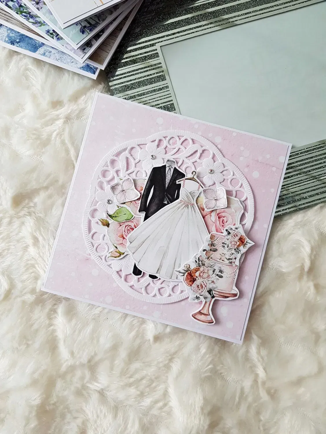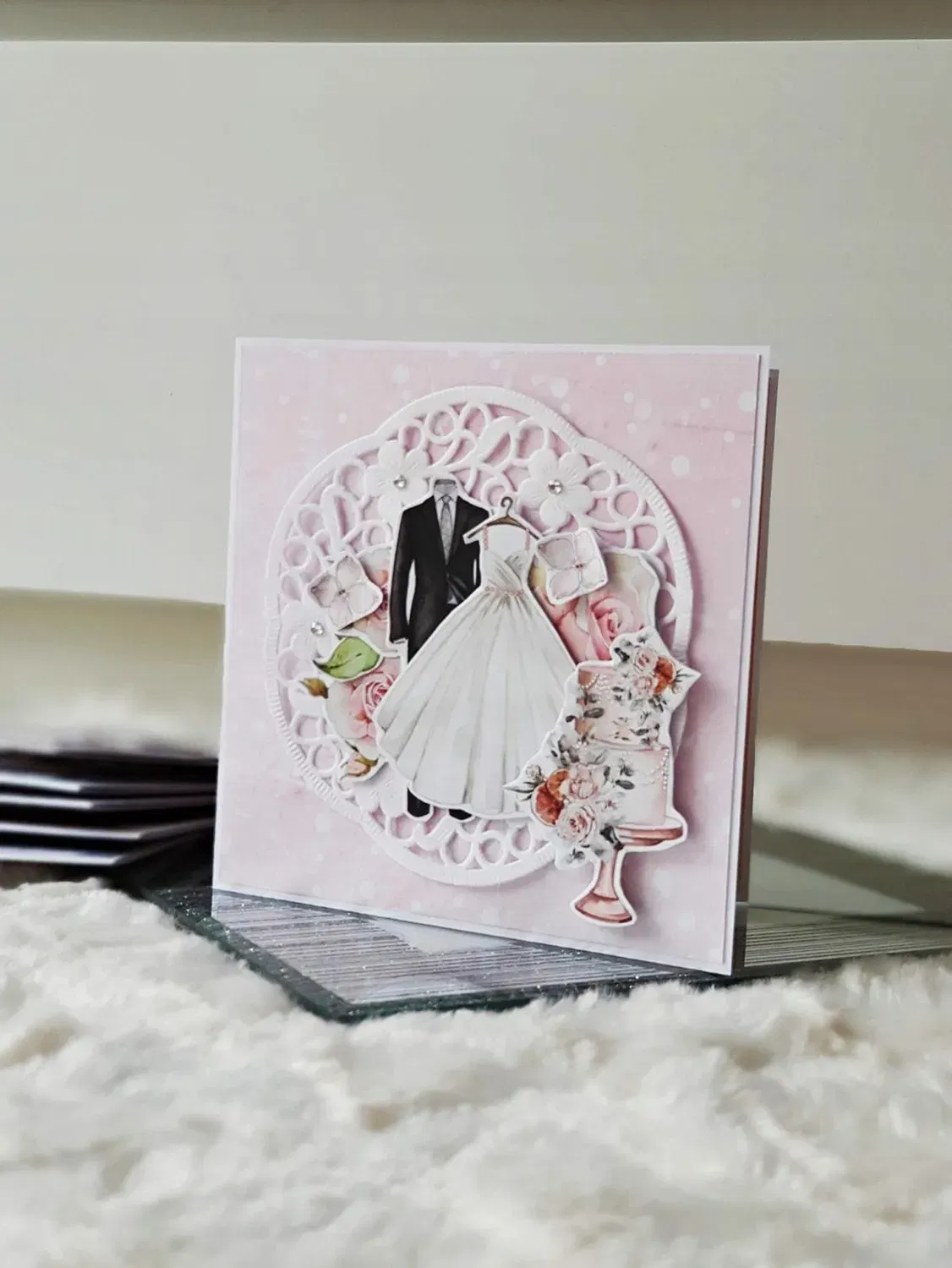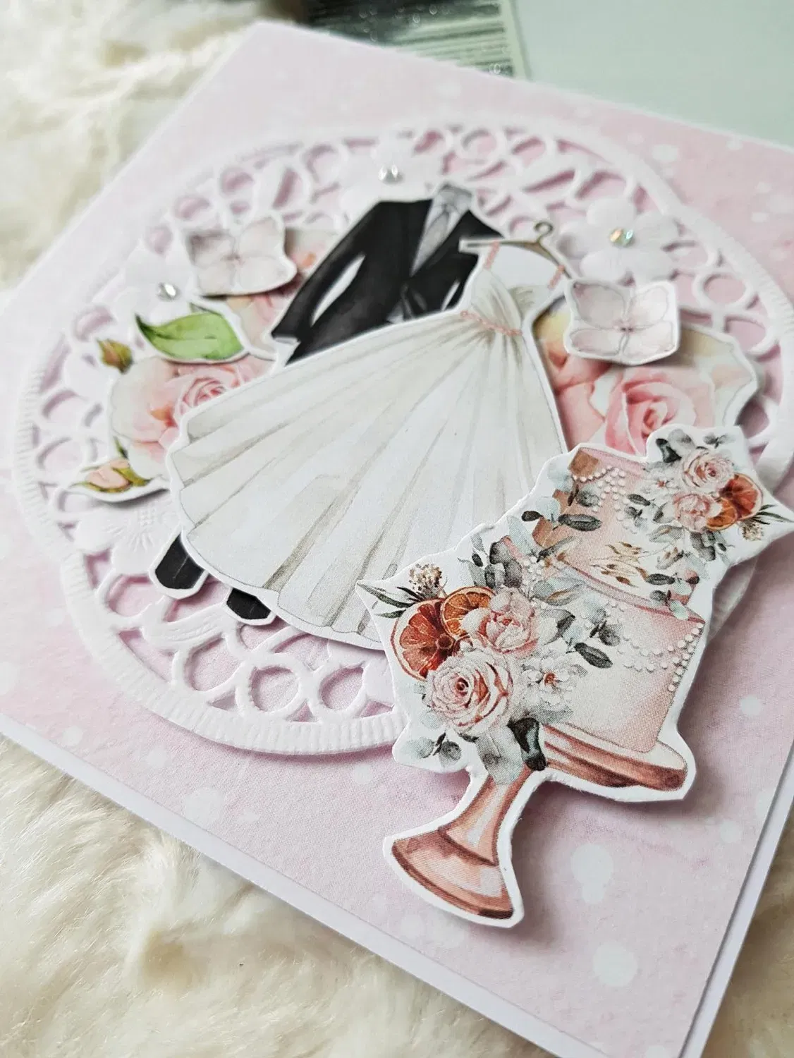 Kartka ślubna - suknia i garnitur, róż, tort