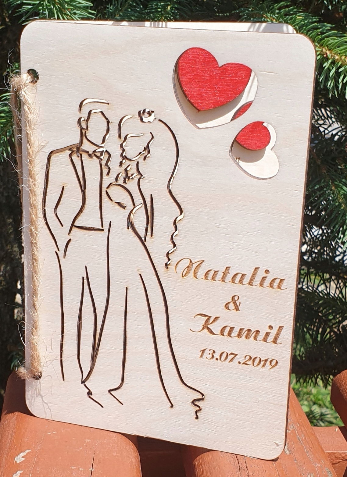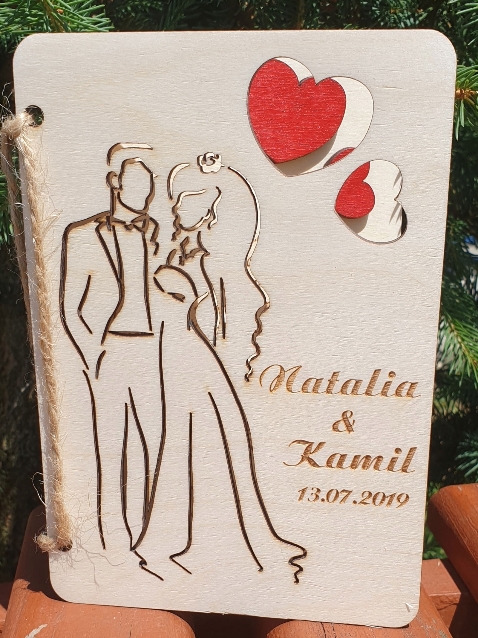 Z przodu wygrawerowane są imiona nowożeńców (lub po prosu osób obdarowanych) oraz data uroczystości wraz z przepiękną, wycięta grafiką.