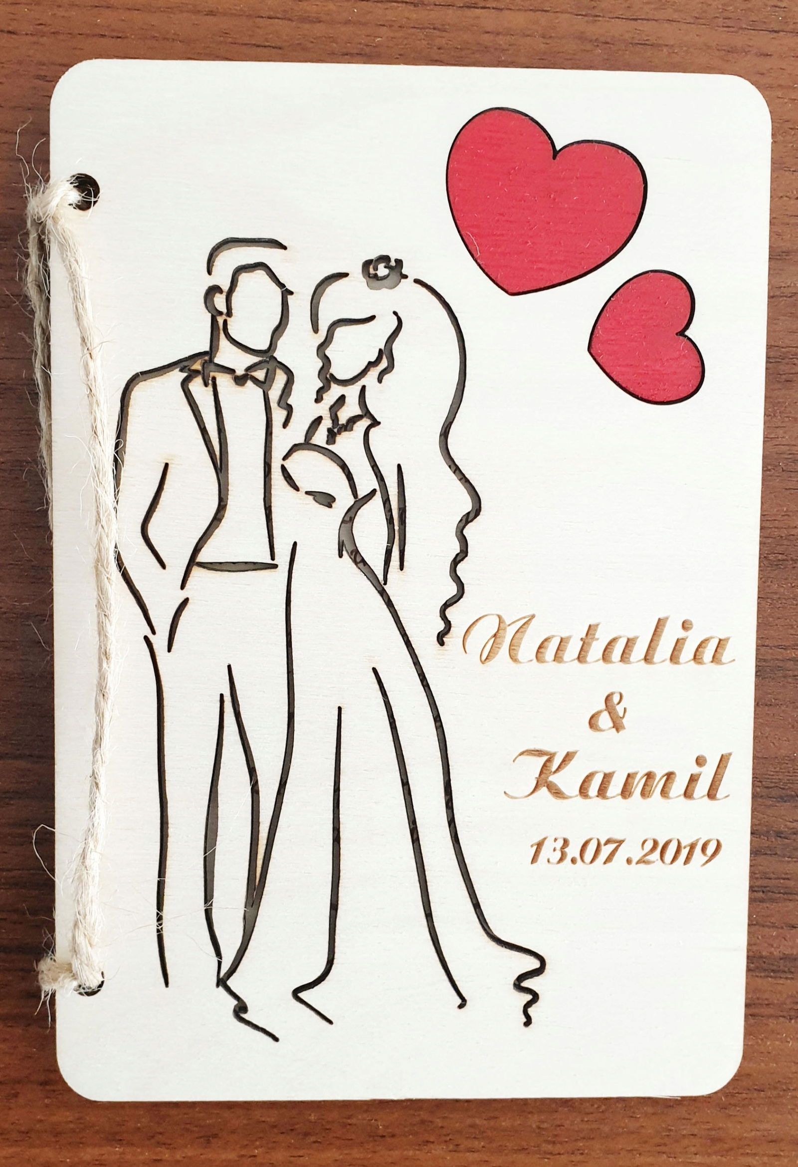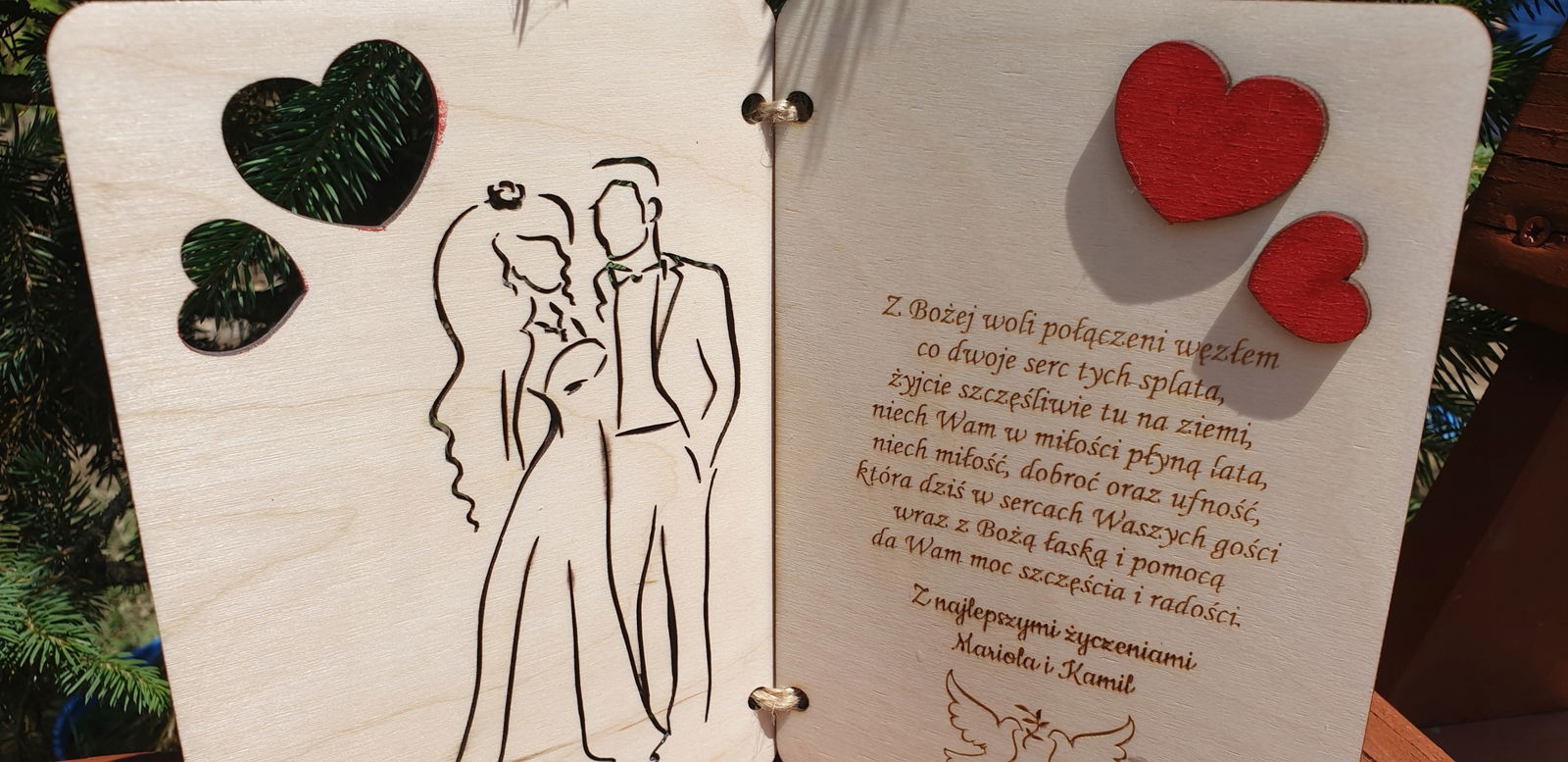 Z przodu wygrawerowane są imiona nowożeńców (lub po prosu osób obdarowanych) oraz data uroczystości wraz z przepiękną, wycięta grafiką.