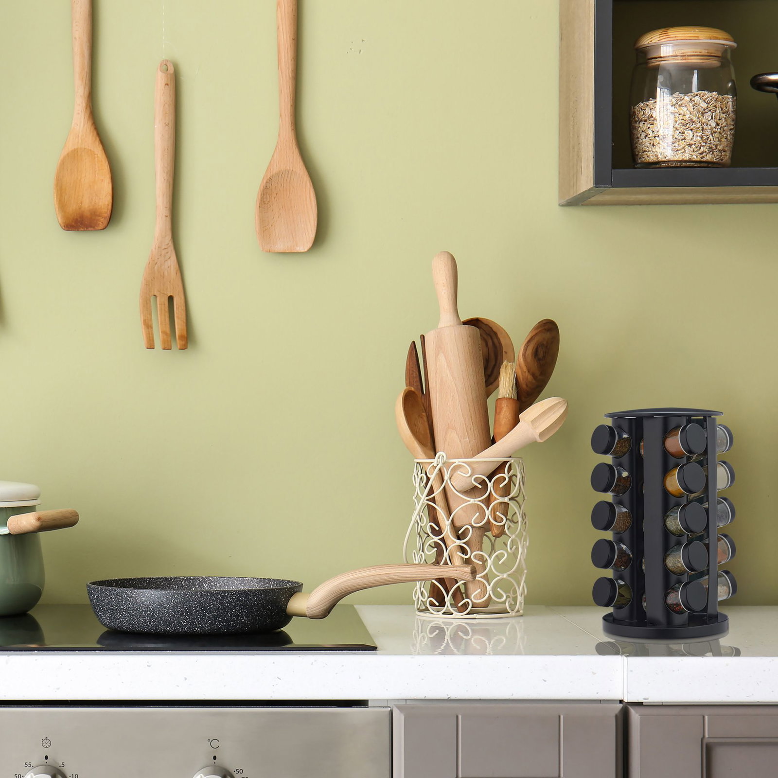 Uwielbiasz gotować, ale Twoją radość za każdym razem psuje bałagan w szafce kuchennej, w której z trudem odnajdujesz potrzebne przyprawy? Nasz obrotowy przyprawnik śpieszy Ci z pomocą! Ten 5-poziomowy stojak na przyprawy wyposażony jest w 20 przezroczystych słoiczków. Dzięki tarczy obrotowej na spodzie umożliwiającej obrót o 360° w mgnieniu oka dostaniesz się do ulubionej przyprawy. Funkcjonalny design tego przybornika na przyprawy pasuje idealnie do nowocześnie urządzonych kuchni.