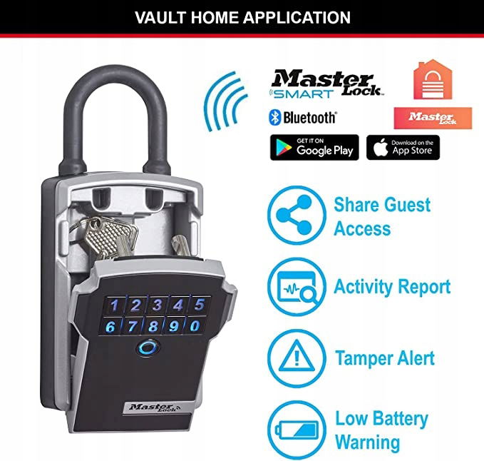 - MASTER LOCK Aplikacja VAULT HOME – za pomocą darmowej aplikacji Master Lock "Vault Home" monitorujesz wszystkie aktywności, a także otrzymujesz komunikaty o sabotażu lub ostrzegawcze z powodu słabej baterii