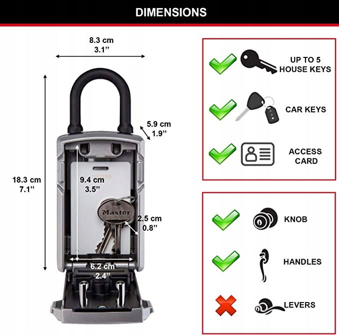 - Przyjazny dla użytkownika: sejf na klucze można otworzyć za pomocą smartfona lub za pomocą kodu numerycznego za pomocą panelu przycisków, jeśli nie ma smartfona