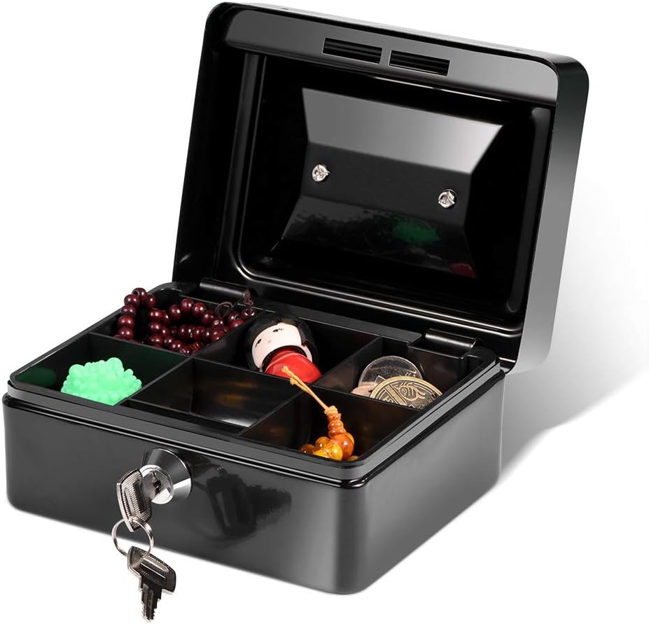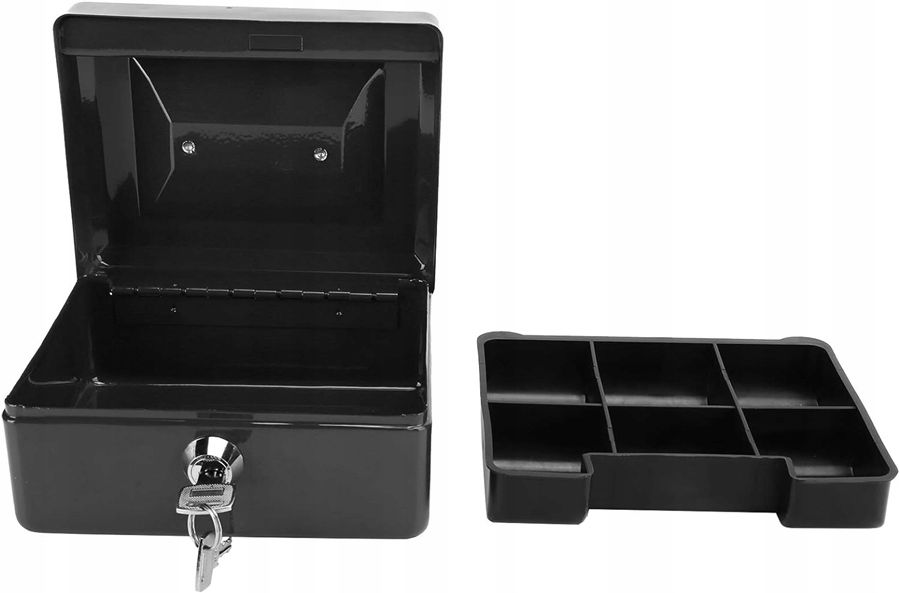 • Wewnątrz kasetki znajduje się wyjmowana tacka z 6 przegródkami na bilony, banknoty, czy też drobną biżuterię.