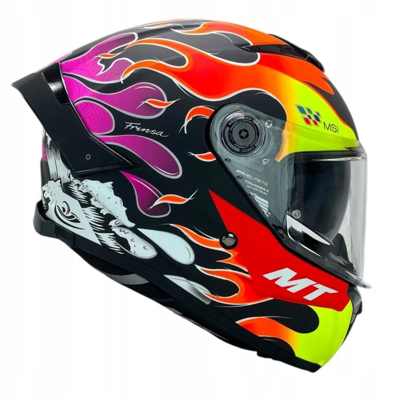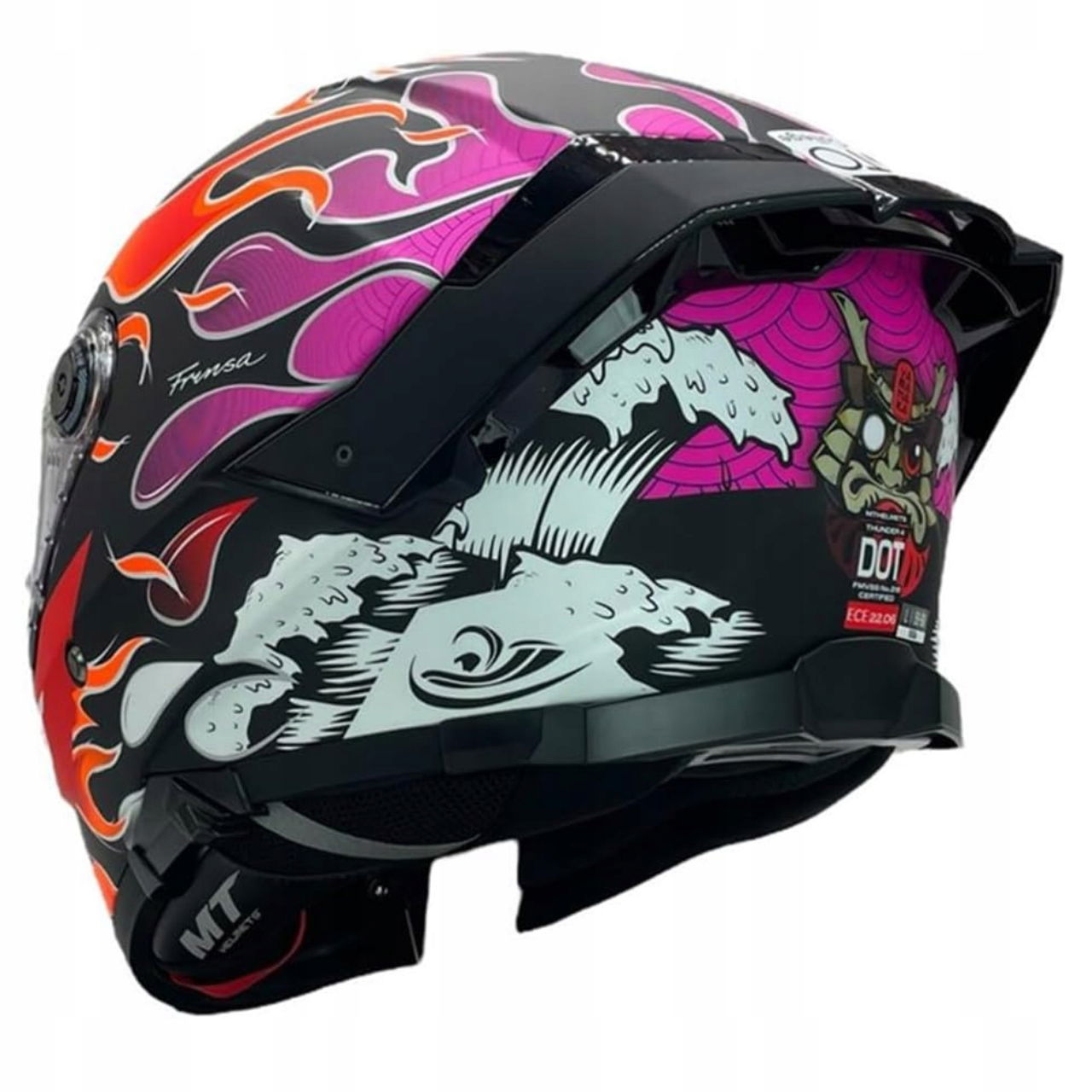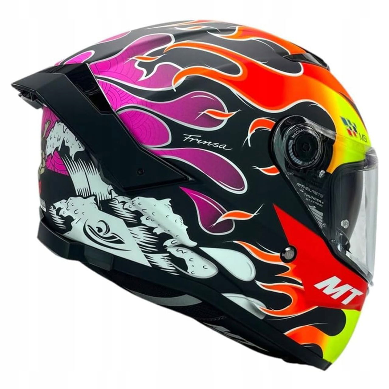 Kask MT Helmets Thunder 4 SV Yamanaka to nowoczesny kask integralny stworzony z myślą o motocyklistach, którzy oczekują maksymalnego bezpieczeństwa, komfortu i stylowego designu. Model ten łączy sportowy charakter z praktycznymi rozwiązaniami, takimi jak zintegrowana blenda przeciwsłoneczna, wydajny system wentylacji i najwyższy standard homologacji ECE 22.06. Unikalne połączenie kolorów – różowego i pomarańczowego – sprawia, że Thunder 4 SV Yamanaka wyróżnia się na drodze, zachowując przy tym nowoczesny i dynamiczny wygląd