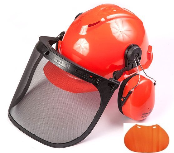 Profesjonalna i trwała maska ochronna + kask z siatki przeznaczona dla pracowników obsługujących takie narzędzia jak pilarki,kosy itp., przy których wymagane jest zabezpieczenie twarzy,głowy i karku przed odpryskami i wiórami oraz uszu przed nadmiernym hałasem.