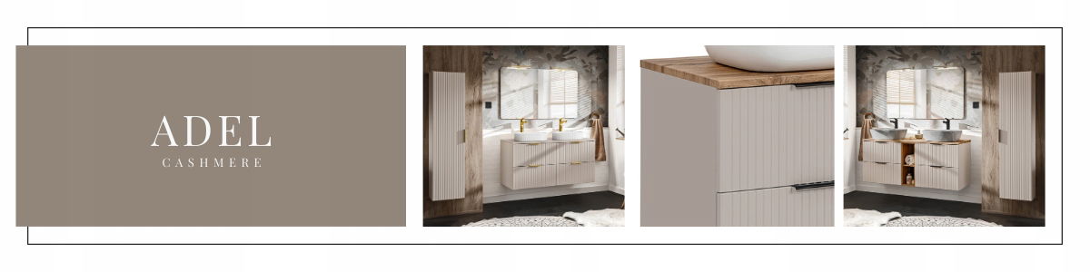 Kolekcja ADEL w nowej, kaszmirowej odsłonie to klasyczne proporcje brył połączone z wyjątkowymi frezowanymi pionowo frontami. Dzięki takiemu zestawieniu meble z tej kolekcji są uniwersalne i idealnie sprawdzają się zarówno w nowoczesnych, jak i klasycznych aranżacjach, a ich wysoka funkcjonalność zapewni komfort nawet najbardziej wymagającym użytkownikom. Zaletą tej kolekcji jest również możliwość wyboru koloru uchwytów, ponieważ w zestawie do każdej szafki są trzy opcje kolorystyczne: złoty połysk, chrom połysk oraz czarny mat. Dzięki temu możemy dopasować kolor uchwytów do armatury, luster w różnych kolorach ram lub w przyszłości odświeżyć wygląd mebli.