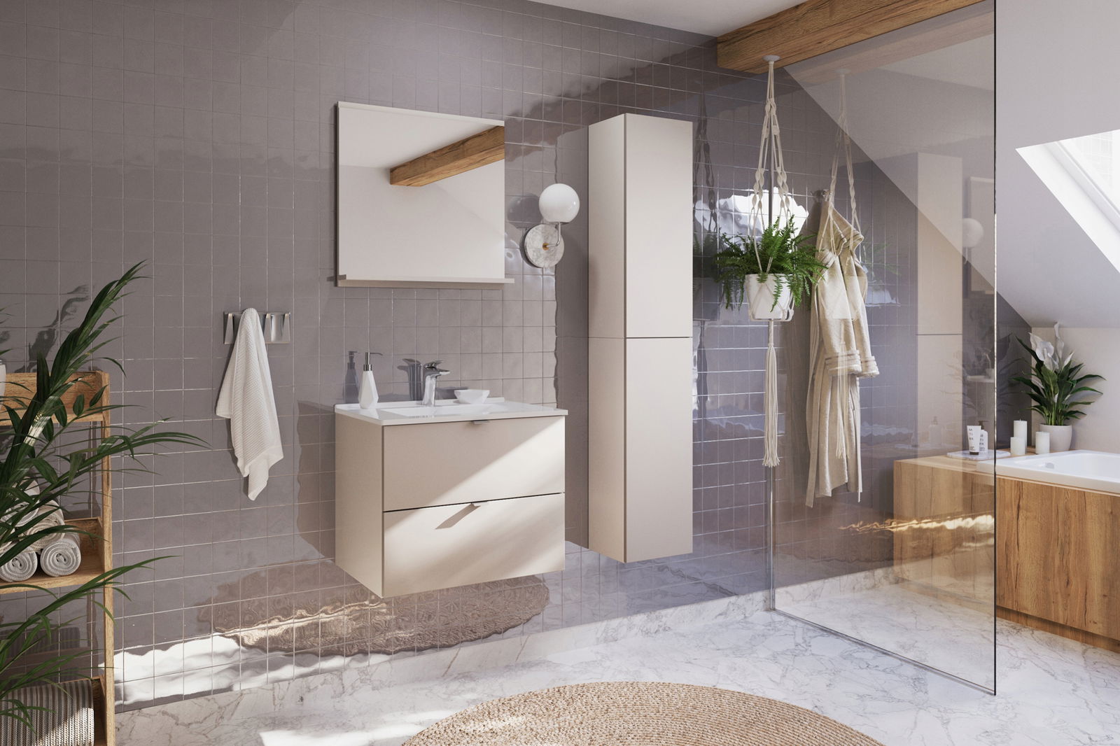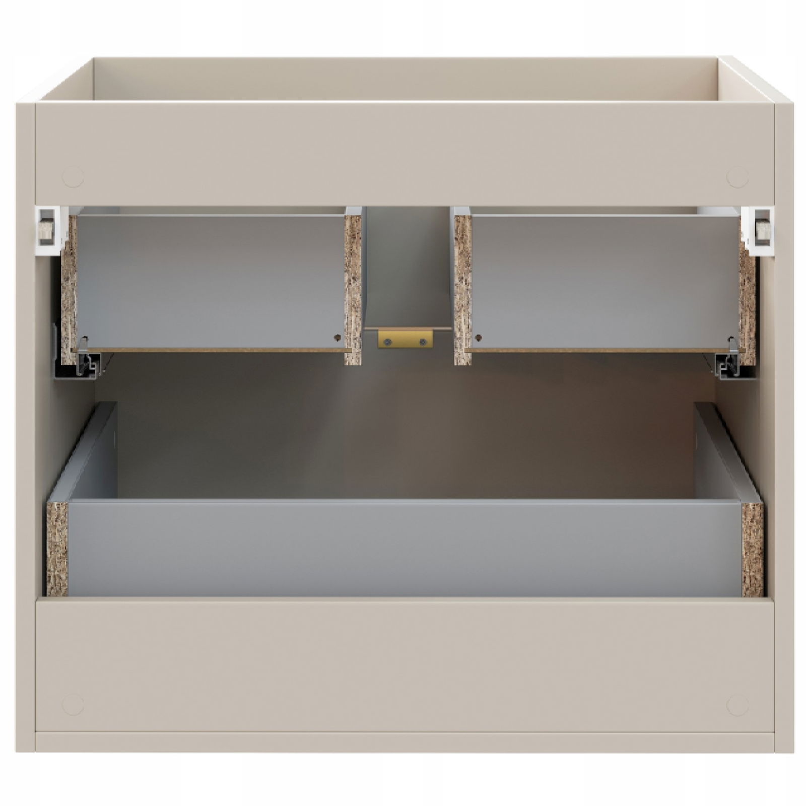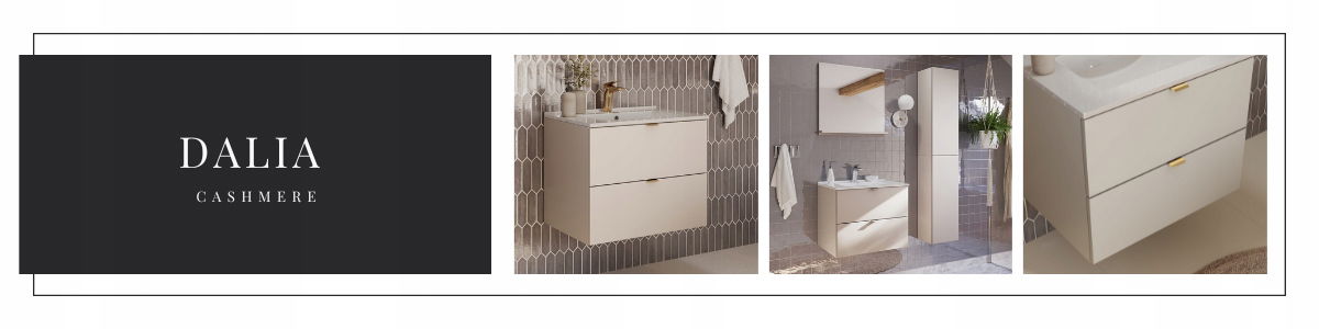 Meble łazienkowe DALIA CASHMERE to kwintesencja minimalistycznego stylu. Gładkie fronty, pozbawione zbędnych ozdobników, zachwycają prostotą, a wykończenie w odcieniu kaszmiru wprowadza do wnętrza łagodną, ciepłą atmosferę. Trzy kolory uchwytów – złoty połysk, chrom połysk oraz czarny mat – pozwalają na personalizację i dostosowanie mebli do indywidualnych preferencji.