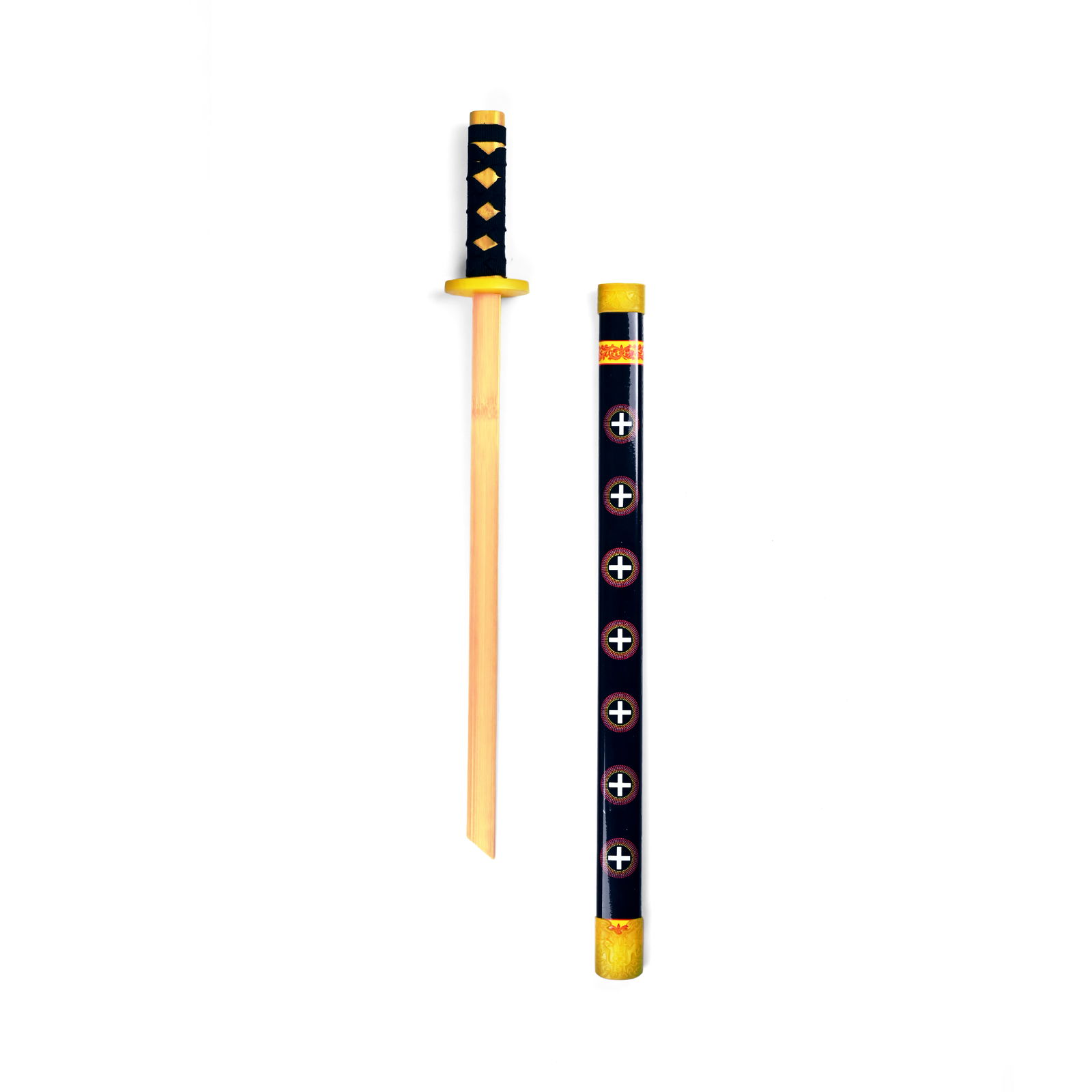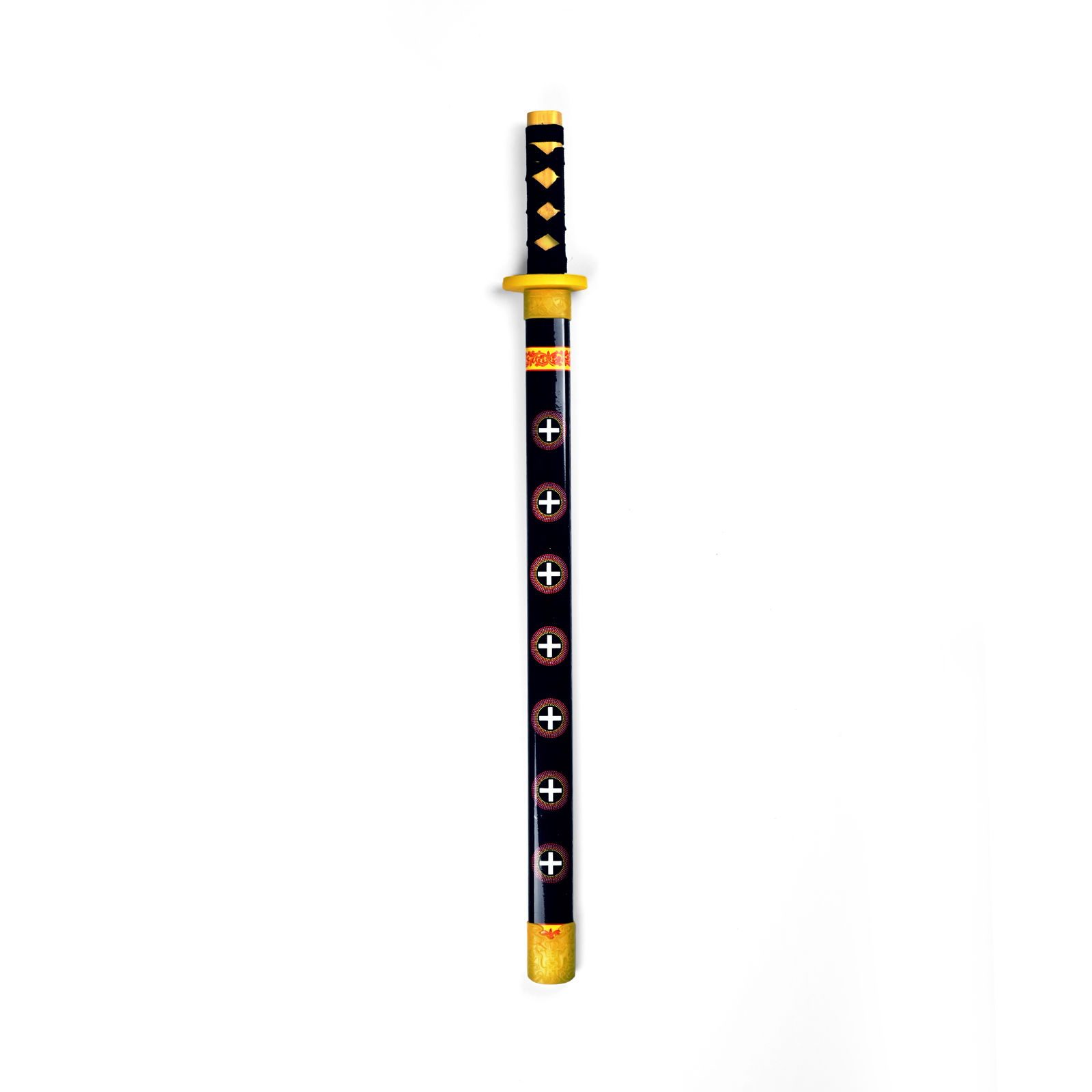 Dla wymagającego fana anime, ta drewniana replika katany o długości 55 cm oferuje wyjątkowe połączenie rzemiosła i tradycji, z zamiłowaniem do dramatycznych historii ukochanych w kulturze anime. Materiał drewniany zapewnia solidną konstrukcję, odpowiednią do delikatnych zderzeń epickich bitew podczas zabawy, a także autentyczny wygląd do celów ekspozycyjnych. Pochwa katany ma eleganckie, czarne wykończenie ozdobione serią czerwono-białych emblematów, wywołujących istotę japońskiego dziedzictwa i ikoniczne obrazy często widziane w legendach o samurajach. Uchwyt jest ściśle owinięty w czerni, w kontraście do uderzających żółtych akcentów na straży i pomel, oferując przyjemny kontrast i chwytające opowieści dla wielbiciela. Jako element dekoracyjny, ta katana wzbogaca wnętrza o swoją ułożoną elegancję i jest doskonała dla kolekcjonerów szukających 'samurajskich kolekcjonerskich' lub 'japońskich pamiątek'. Wyróżnia się spośród podobnych produktów swoją solidną drewnianą konstrukcją i bogatymi w kulturę szczegółami projektu. Ta replika katany zaprasza Cię, by w Twoich rękach trzymać kawałek historii i animacji, przywołując przygody i duchy Twoich ukochanych postaci z anime do życia. Włącz ten symbol męstwa i opowieści do swojej kolekcji i niech będzie świadectwem Twojej pasji.