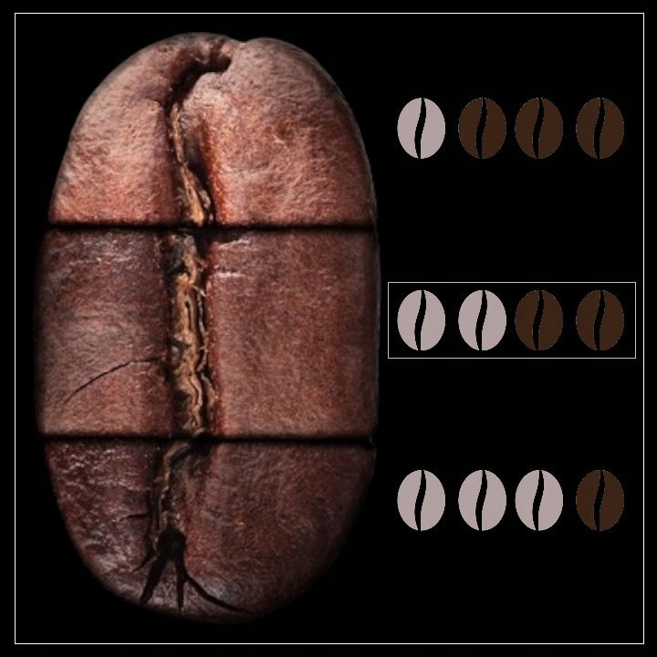 My preferujemy najbardziej optymalny stopień średni. Dzięki paleniu metodą ,,Omniroast” zamykamy w strukturze ziarna olejki bogate w smak i aromat. Pozwala to podczas przygotowywania kawy wydobyć z niej najlepsze i unikalne walory poszczególnych odmian ziaren, dzięki czemu możemy delektować się pyszną i aromantyczną kawą i odkrywać głębie jej smaku z każdą kolejną filiżanką.